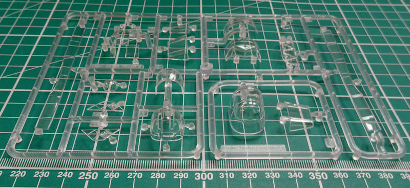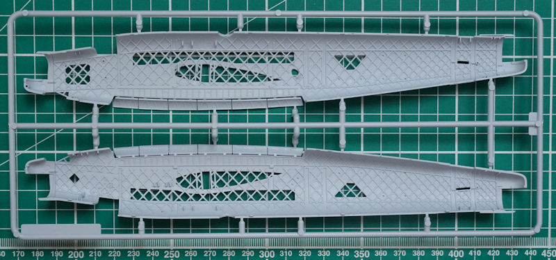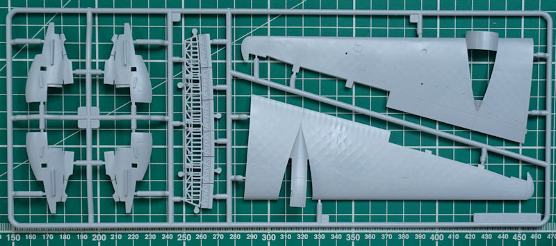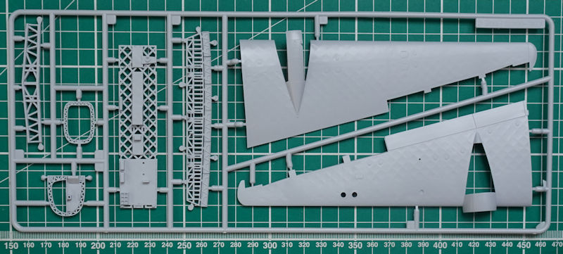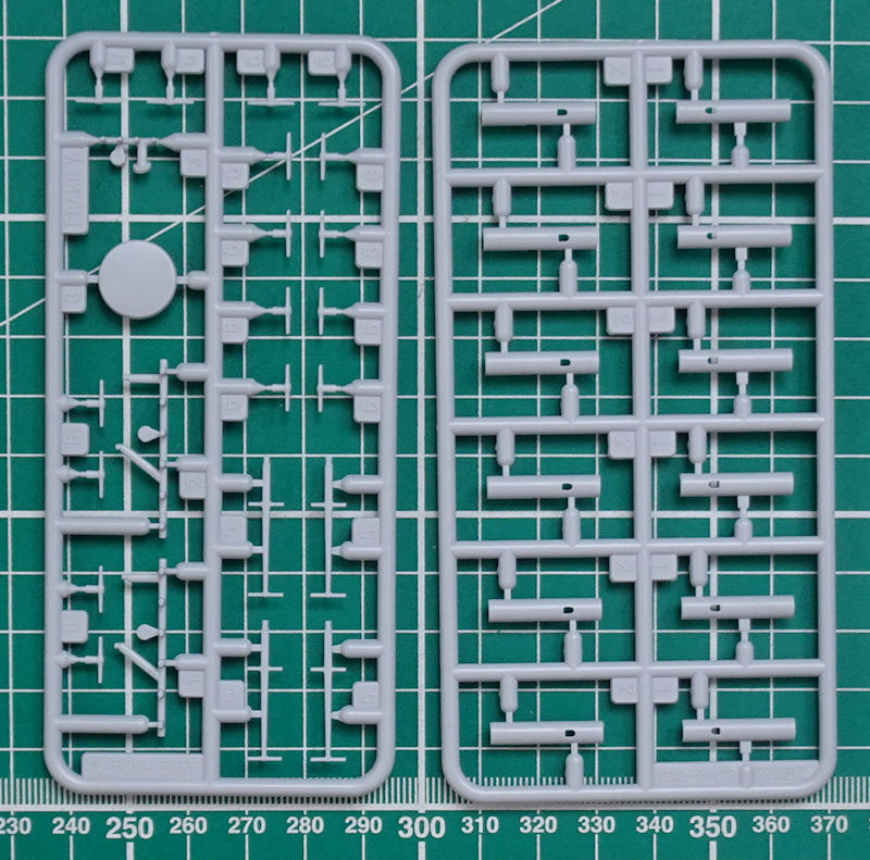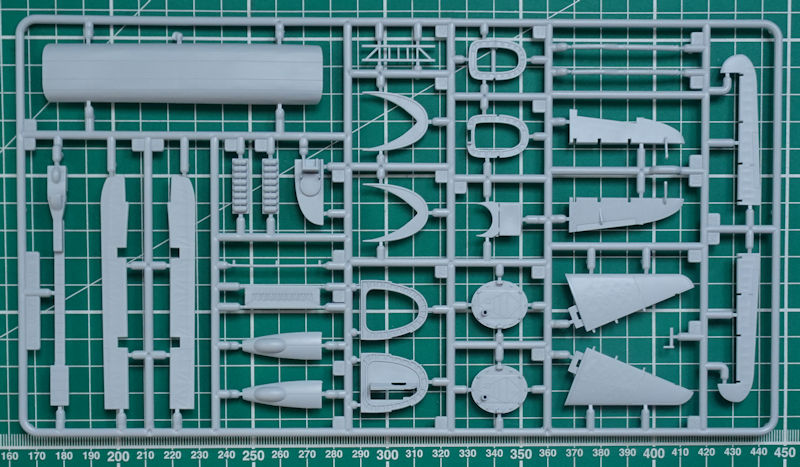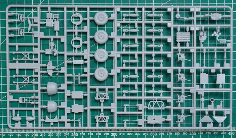 In dem attraktiven praktischen Stülpkarton befinden sich gut verpackt acht hellgraue Spritzlinge mit 163Teilen, einem klarem Spritzgussrahmen mit 15 Teilen, ein Decalbogen, die mehrfarbige Bau- und Bemalungsanleitung. Zwei Spritzlinge mit speziellen Teilen für die GR Mk. VII sind neu. Die Teile entsprechen dem heutigen Stand des Formenbaus. Es gibt eine wunderschöne, keineswegs übertriebene, Oberflächengestaltung. Man hat diese typische verspannte Oberfläche sehr gut getroffen. Natürlich ist sie für den Maßstab leicht übertrieben. Das ist in diesem Fall gut so, denn somit wirkt das Modell lebendig.