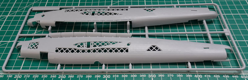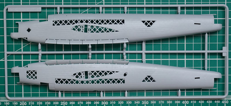 Der Bombenschacht soll von Haus aus offen bleiben und dafür hat man die Klappen dafür in der richtigen Stellung an die Rumpfhälften anmodelliert. Es gibt ja auch die komplette Ausstattung samt Abwurfwaffen. Hier liefert Airfix auch die Wasserbomben mit. Vor dem Verkleben der beiden Rumpfhälften wird ein stabiler vorbildgerechter Holm eingezogen. Wer will, der kann auch den Schacht verschließen. Dazu müssen die Klappen entfernt werden und ein neues Bauteil deckt diesen ab.