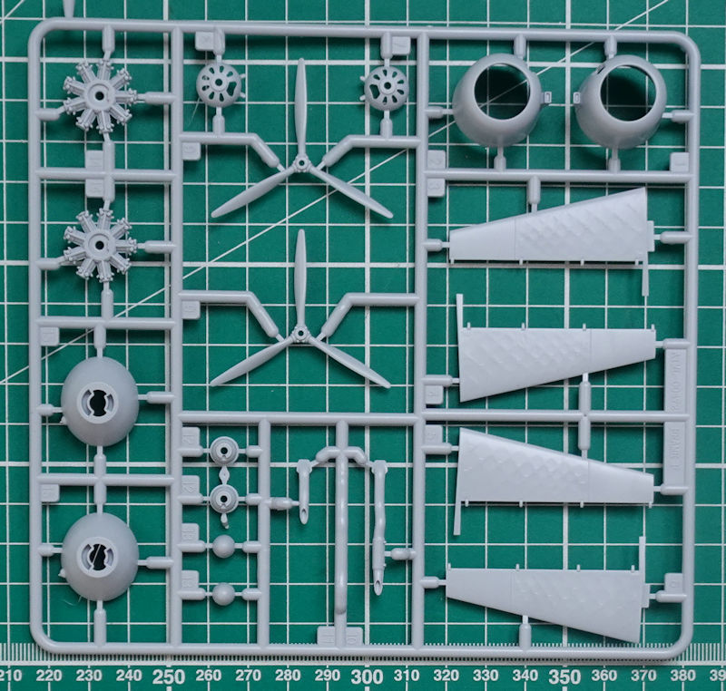 Das Fahrwerk kann natürlich in aus- oder eingefahrener Position gebaut werden. Die Räder sind leicht abgeplattet. Eine Beschriftung auf den Flanken gibt es leider nicht. Dafür gibt im Innern der Fahrwerksschächte und schöne Details. Das Brandschott verschließt den Fahrwerksschacht. Dann folgen gut detaillierte Pegasus-Sternmotore. Die Motorhaube wird quasi "schwebend" über den Motor geklebt und damit kann man von hinten zwischen die Klappen schauen. Beide Luftschrauben sind einteilig und die Spinner gibt es separat.