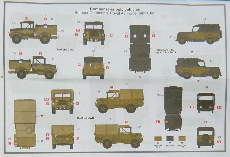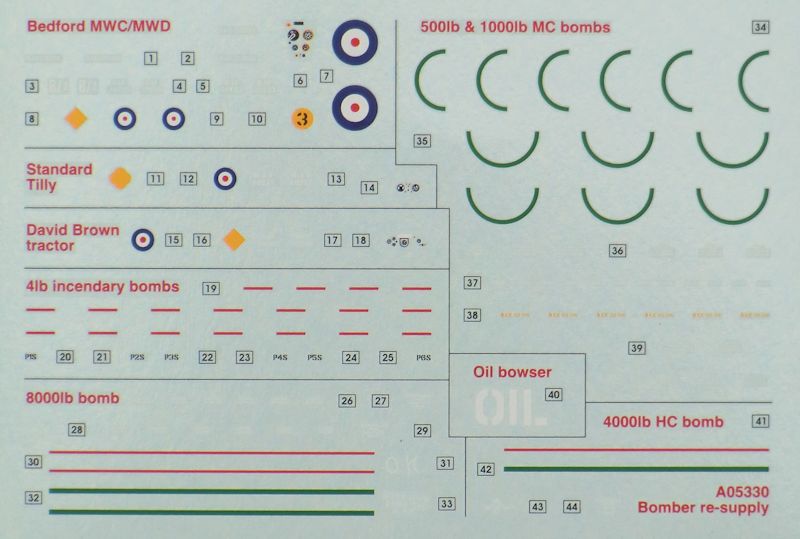 Der tadellos gedruckte Decalbogen enthält alle notwendige Markierungen. Damit können die Fahrzeuge und die Abwurfwaffen markiert werden. Sehr hilfreich sind die mehrfarbigen Bemalungsanleitungen.