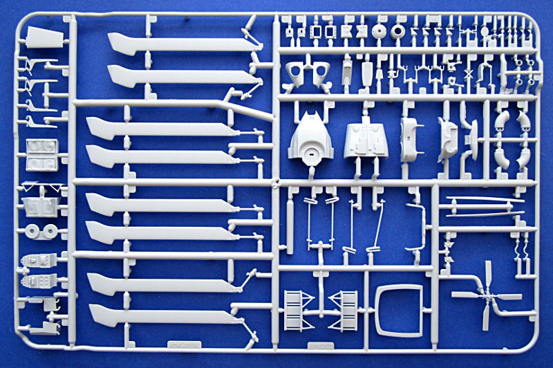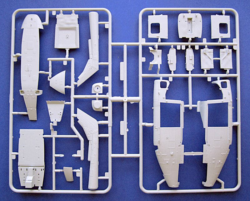 Drei große graue Spritzlinge sowie ein klarer Gießrahmen enthalten die Teile für die Versionen. Die Rotorblätter können im Flugmodus und verstaut (eingeklappt) an das Modell gebaut werden. Weiterhin sind einige Bewaffnugs- bzw. Missionsvarianten baubar. Wie schon im Review zum Mk.88 geschrieben, liegt die Passgenauigkeit irgendwo zwischen gut und mäßig. Eine Vorbereitung und Versäuberung der Teile ist in jedem Fall notwendig. Während des Klebens ist auf genaue Ausrichtung zu achten … die Passzapfen geben hier einen gewissen Spielraum. Anderen Muss aber auch erst etwas Spielraum geschnitzt werden. Diese Ausführungen machen vielleicht schon deutlich, dass das Modell trotz überschaubarer Größe nicht von Jedem einfach zusammengebaut werden kann.