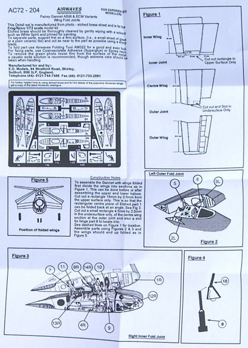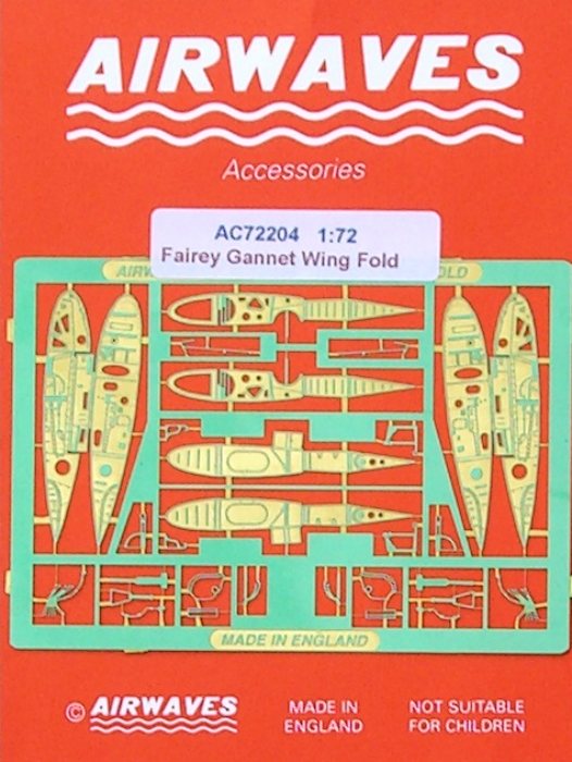 Das AIRWAVES-Set 72204 erlebte bei Hannants inzwischen eine Wiederauflage. Es ist eigentlich für den alten FROG / NOVO Bausatz der Fairey Gannet gedacht, der ja sehr einfach gestaltet war. Diese Set enthält alle Teile, die notwendig sich, die Gannet-typischen Faltflügel darzustellen. Die Bauanleitung enthält auch sehr detaillierte Hinweise, wo die einzelnen Schnitte platziert werden müssen, um die Flügel zu teilen. Weiterhin gibt es eine wunderschöne Skizze, die zeigt, wohin die einzelnen Teile gehören.