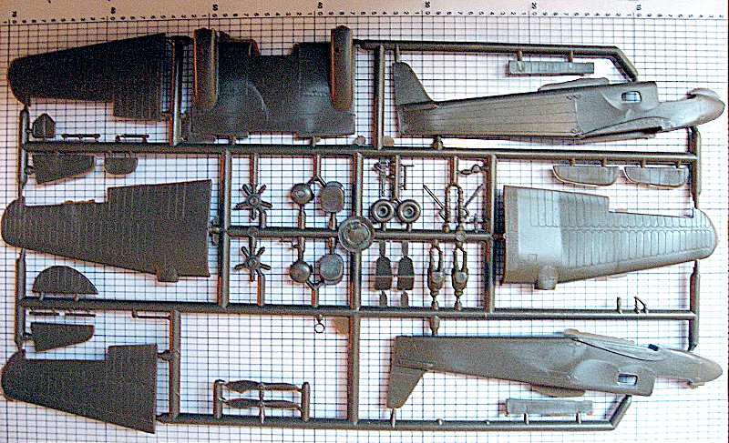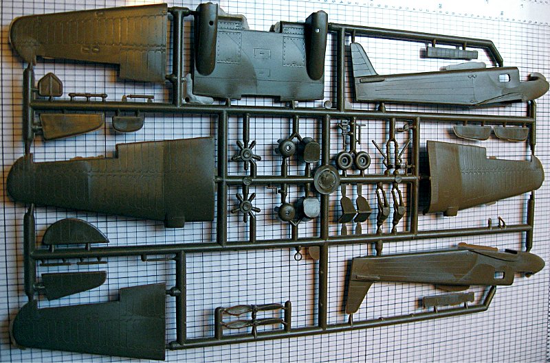 Bausatz: Dieser beinahe wie ein Spielzeug wirkende Bausatz mit wenigen grobschlächtigen und dazu noch übermäßig massiv geratenen Teilen, macht zunächst einen primitiven Eindruck. Sieht man jedoch genauer hin, bemerkt man schnell das Rumpf und Tragflächen sehr feine und stimmig wirkende Oberflächendetails besitzen und an den Räder akkurate Felgen ausgebildet sind. Die wenigen Kleinteile sind zwar leicht grob geraten und weniger fein detailliert abgegossen, aber immerhin vorhanden. Auch die Klarsichteile sind angesichts des Entstehungsalters noch fast in Ordnung, da es bereits völlig vorbildgerechte also flache Streben bzw. Scheibeneinfassungen gibt.