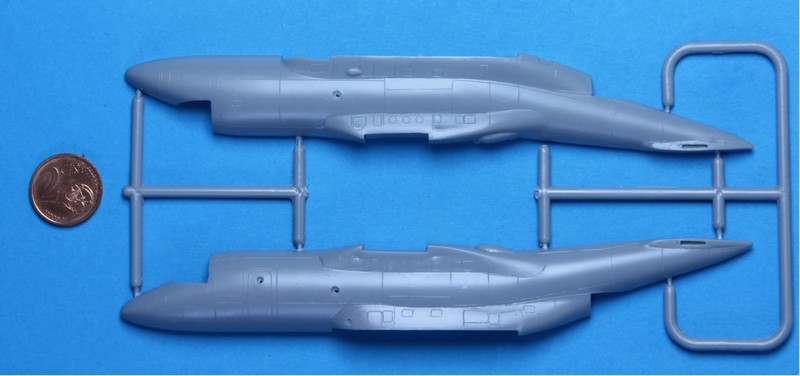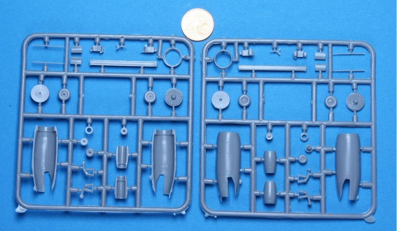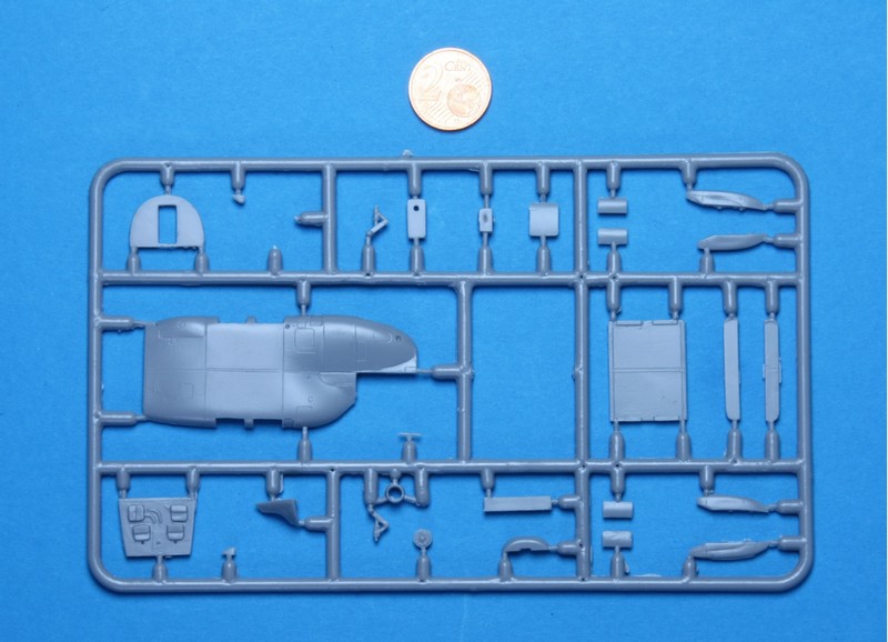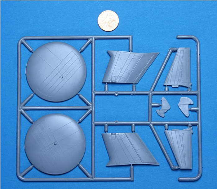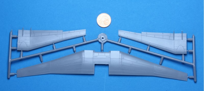Ansonsten gefallen aber die feinen Details auf dem Teilen. Auch ist ein recht brauchbares Cockpit vorhanden. Die Trag- und Stabilisierungsflächen mit Ausnahme des neuen Seitenleitwerkes haben einteilige Hinterkanten, was dem Bild des fertigen Modells zuträglich sein sollte. Bei meinem Exemplar sind einige Gravuren auf der Oberseite der Tragflächen mit Grat gefüllt, mit ein wenig Säuberungsaufwand sollte das aber wieder herstellbar sein.