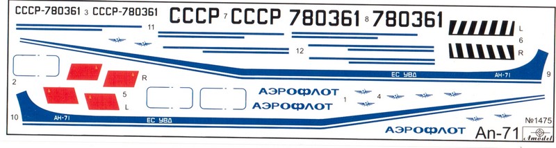 Modell: Vor rund fünf Jahren hat Amodel in 1:144 die An-72/74 Familie in zahlreichen Bausätzen auf den Markt gebracht. Nun ist die Variante An-71 erschienen. Augenscheinlichstes Unterscheidungsmerkmal ist wie schon erwähnt das gänzlich andere Leitwerk. Um diesem und dem dritten Triebwerk im Rumpf Rechnung zu tragen, hat man bei Amodel einen gänzlich neuen Rumpf entwickelt. Auch die andere Form der Verkleidung des Fahrwerkes wurde beachtet. Grundsätzlich ist der Kit ein typischer Vertreter eines Short Run Bausatzes, es muss also mit erhöhten Aufwand beim Bau gerechnet werden. Ein Beispiel dafür ist z.B., dass das Seitenleitwerk stumpf auf dem Rumpf angeklebt werden muss.