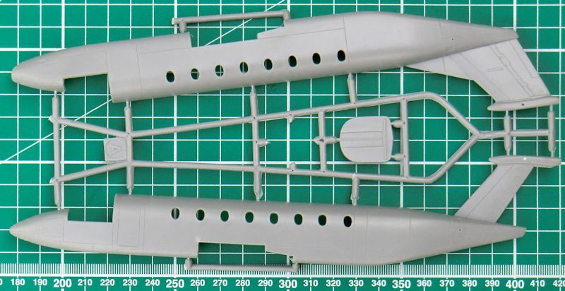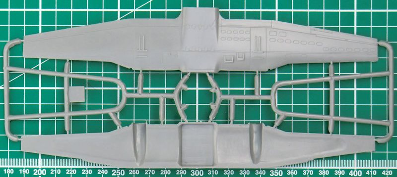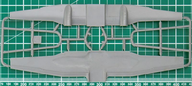 Leider bleibt die Passagierkabine leer. Das ist kein Problem, denn eine Tür kann nicht in geöffneter Position angeklebt werden. Der Flügel besteht aus unterer und oberer Hälfte. Da ist dann die Flügelstellung vorgegeben. An den Enden gibt es einzelne Positionslichter. Die Tragflächenhinterkante ist scharf. Gleiches gilt auch für Seiten- und Höhenleitwerk.