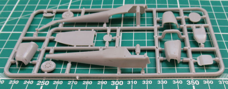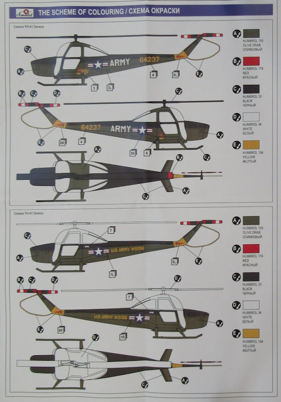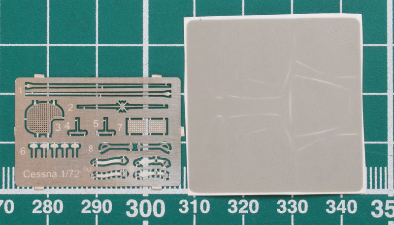 Bausatz: Amodel ist für Exoten gut. Die Cessna YH-41 Seneca kannte ich vor dem Erscheinen des Bausatzes nicht. So wurde ich durch das Erscheinen durchaus überrascht. In dem typischen praktischen Stülpkarton befinden sich sehr gut verpackt zwei graue Spritzlinge mit 50 Teilen, ein klarer Spritzling mit fünf Teilen, ein Fotoätzteilbogen, Vinylmasken, zwei Decalbögen, eine mehrfarbige Bemalungsanleitung und die Bauanleitung.