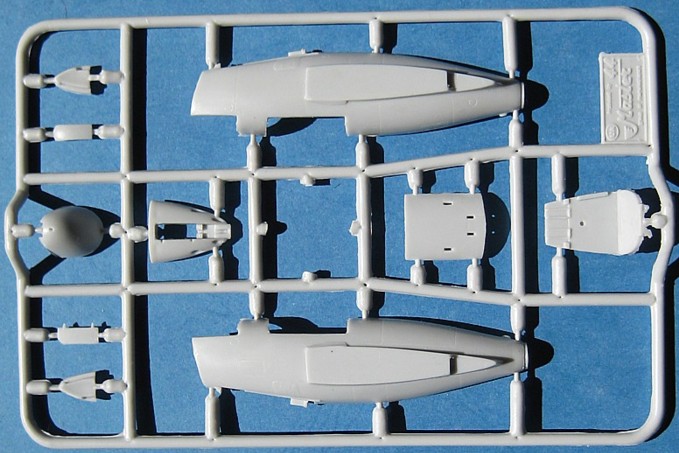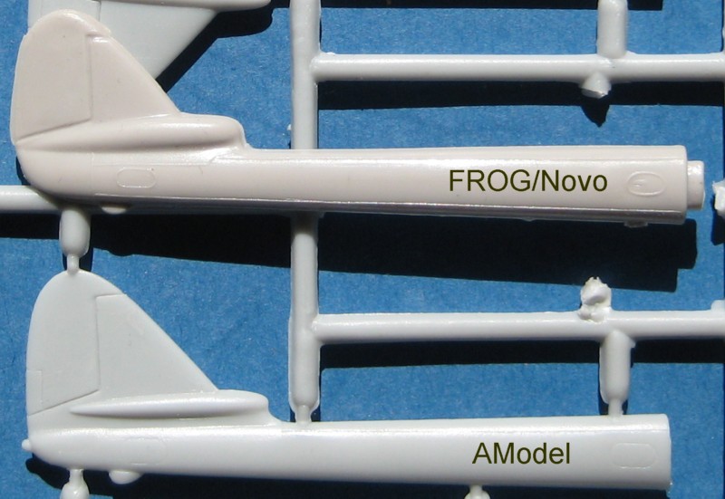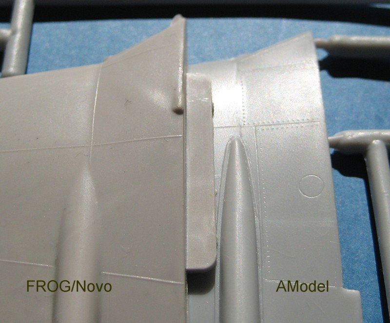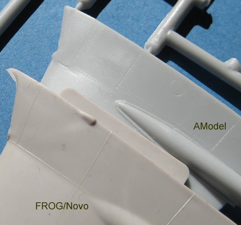 Hinsichtlich der Formtreue muss sich der Bausatz natürlich einen Vergleich mit dem ca. 50 Jahre alten FROG-Bausatz gefallen lassen. Auffällig wird dabei, dass Amodel wie Heller einen viel zu geringen Öffnungswinkel der Lufteinläufe aufweist.