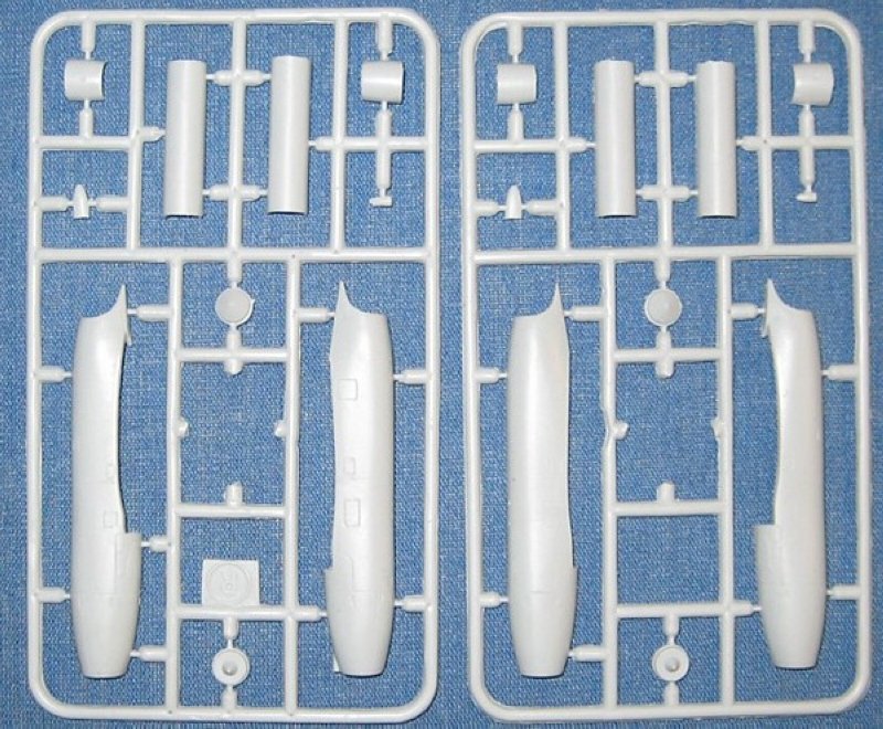 Die Triebwerke sind ordentlich dimensioniert und weisen eine korrekte Taillierung auf. Allerdings ist durch die komplette Längsteilung eine saubere Verarbeitung der Lufteinläufe bei einer Montage wie sie die Bauanleitung vorschreibt kaum möglich. Hier sollte man entweder die Triebwerksvorderteile abtrennen, von innen verschleifen und dann als Kappe wieder ansetzen, oder die Lufteinlässe abdecken.
