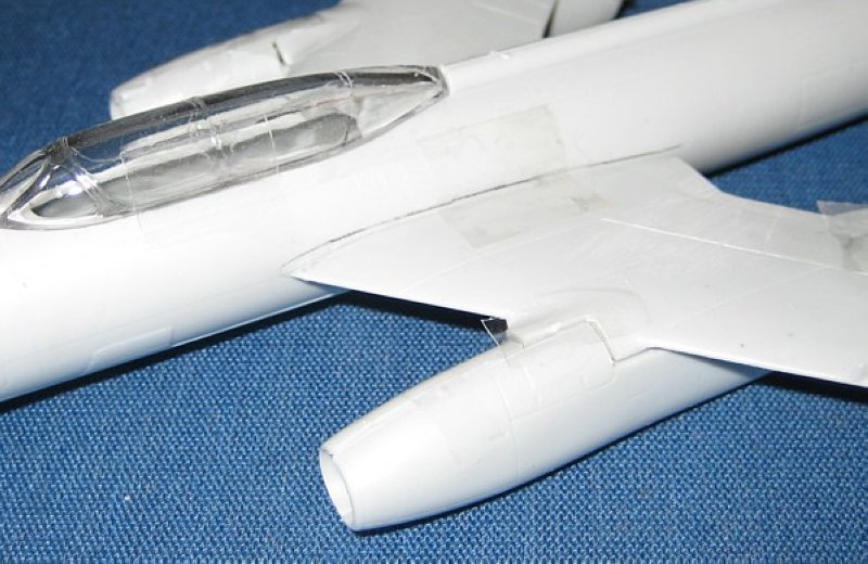 Ein Fehler ist mir am Bausatz aufgefallen. Die Darstellung der Spaltverkleidung zwischen Rumpf und Tragfläche wurde vergessen (auf dem Foto mit Bleistift markiert). Da diese bei einer Jak-25 nicht so stark ausgeprägt ist, wie zum Beispiel bei einer MiG-15, lässt sich die Verkleidung durch entsprechendes Gravieren relativ leicht ergänzen.