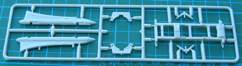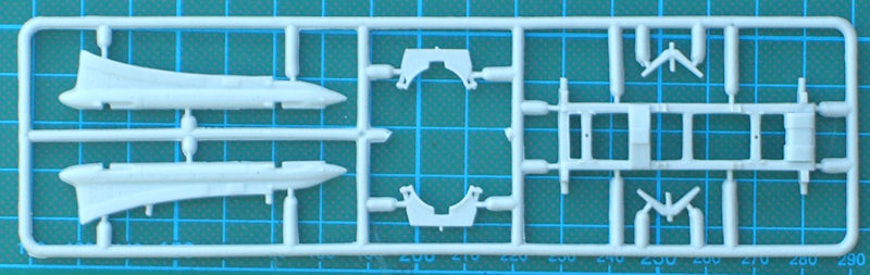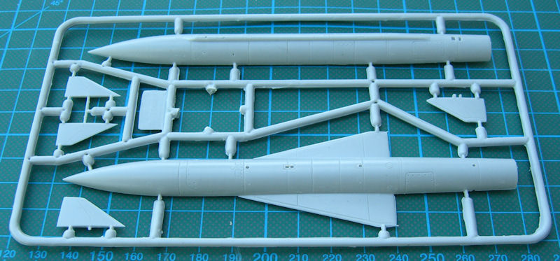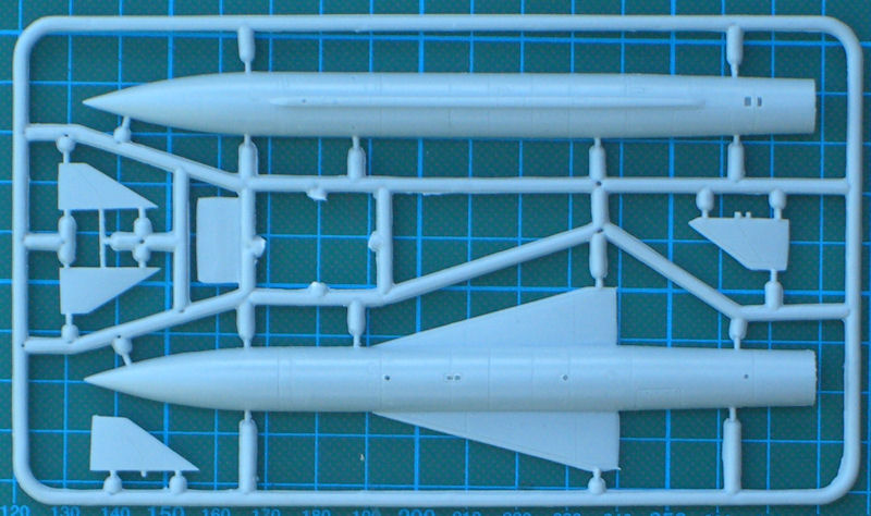 Der Bausatz enthält auch den notwendigen Träger für die Tragfläche der Tu-16. Die Lenkwaffe selbst besteht aus zehn gut strukturierten und detaillierten Bauteilen. Das untere Leitwerk kann seitlich angeklappt montiert werden. So ist es beim Vorbild auch am Boden.