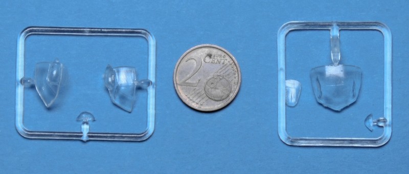 Von den unterschiedlichen Cockpitverglasungen ist allerdings nur jeweils eine vorhanden. Hier muss man dann bei der Vorbildwahl prüfen. Die Klarsichtteile erreichen nicht ganz das Niveau von Großserienbausätzen. Ich würde sie auf jeden Fall einem Bad in Future oder ähnlichen Mittel unterziehen. Die Verglasung mit den beiden gewölbten Beobachtungsfenstern ist in der Mitte zweigeteilt, was sicherlich der Wölbung geschuldet ist.