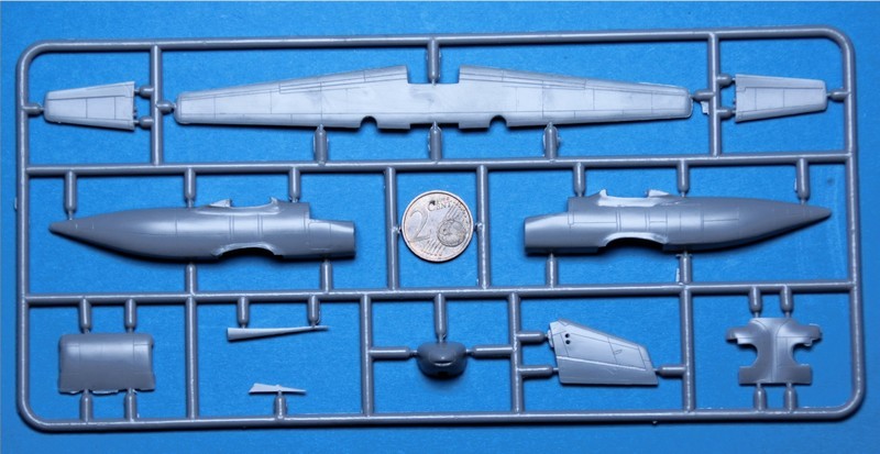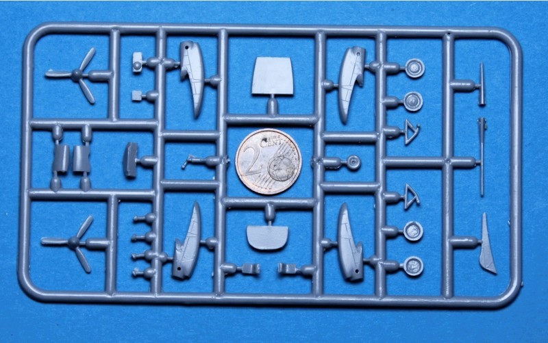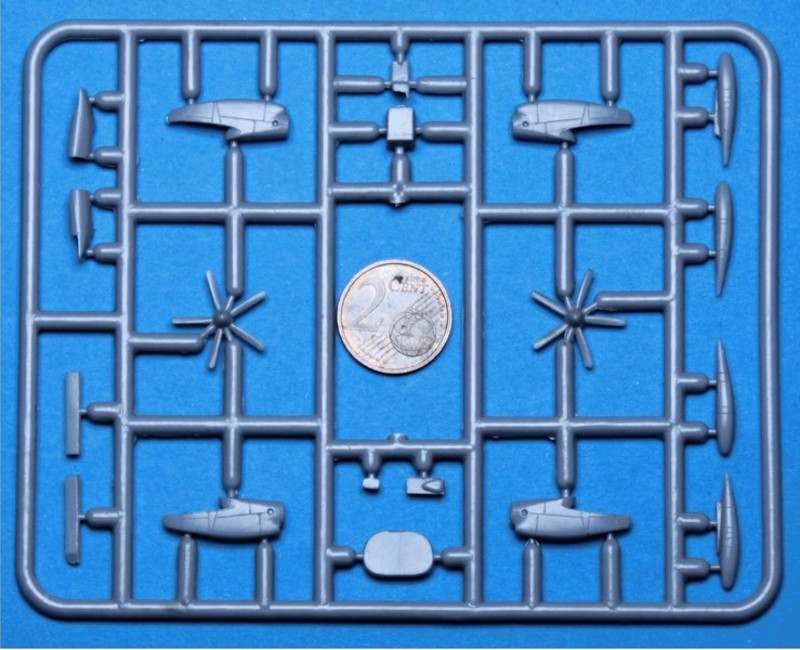 An dem nächsten Spritzling finden sich die Teile für die Triebwerke, Propeller und das Fahrwerk. Beim Betrachten der einteiligen Propeller fällt auf, dass die Blätter in Flugstellung dargestellt sind. Für die typische Segelstellung am Boden müssten sie also angepasst werden. Die beiden Triebwerke verfügen über geöffnete Lufteinlässe. Die jeweils zwei Auspuffe werden separat eingebaut. Das Fahrwerk präsentiert sich als völlig ausreichend in diesem Maßstab.