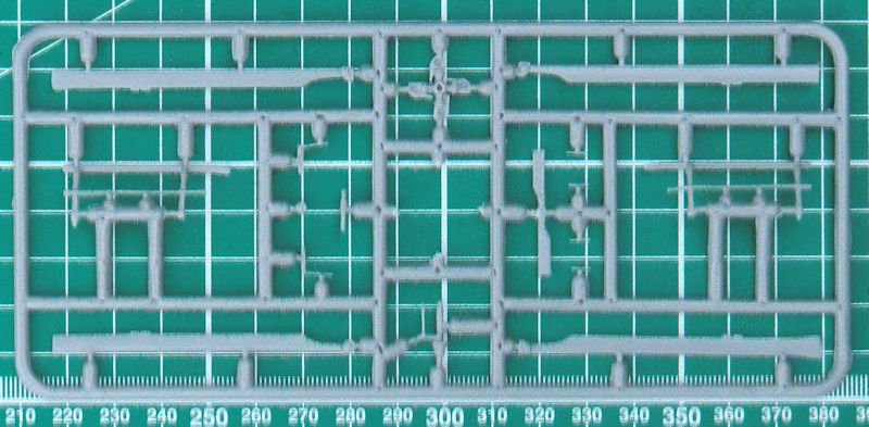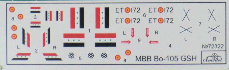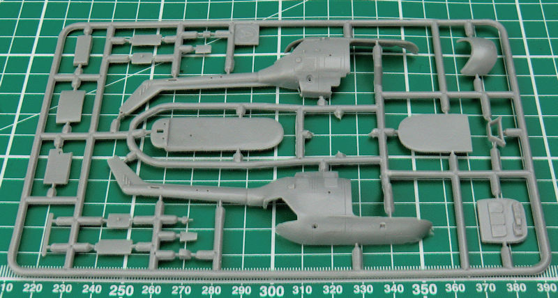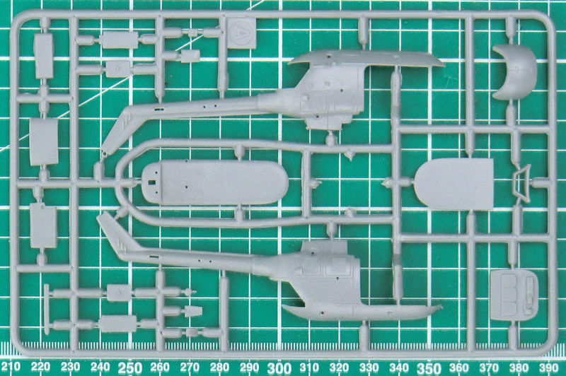 In dem typischen Stülpkarton befinden sich gut verpackt vier hellgraue Spritzlinge mit 72 Teilen, ein Klarsichtrahmen mit sieben Teilen, ein Decalbogen und die Bauanleitung. Ein paar Teile sind für andere Versionen bestimmt und wandern in die Restkiste. Es handelt sich um einen typischen Shortrun-Bausatz von Amodel. Die Strukturen sind fein und versenkt. Es gibt sehr wenig Grat aber die Klarsichtteile sind etwas dick. Allerdings stellt man auch im Vergleich schnell fest, dass die Spritzgussrahmen nicht mit denen aus dem zivilen Bausatz von 2014 identisch sind. Statt Spritzling E gibt es nun einen mit G beschrifteten. Diverse Schwächen im Detail sollen vorhanden sein. Allerdings gibt es kaum vernünftige Informationen zu denen in Spanien gebauten irakischen Bo 105…
