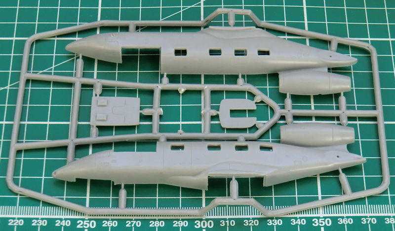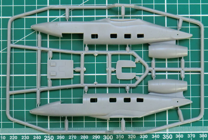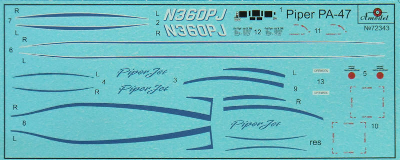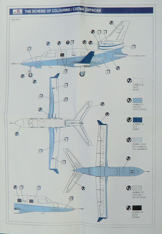 Bausatz: Amodel hat diverse Businessjets im Angebot. So passt natürlich auch die Piper PA-47 sehr gut ins Programm. In dem typischen etwas wabbeligen trotzdem praktischen Stülpkarton befinden sich gut verpackt vier hellgraue Spritzgussrahmen mit 74 Teilen, ein klarer Rahmen mit neun Teilen, ein Decalbogen, eine mehrfarbige Bemalungsanleitung und die Bauanleitung.