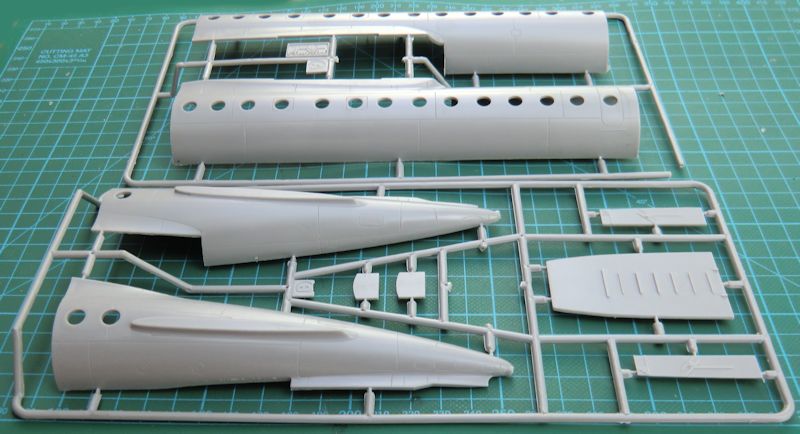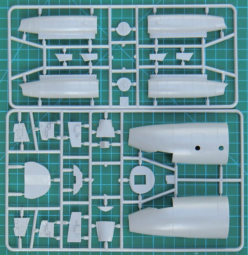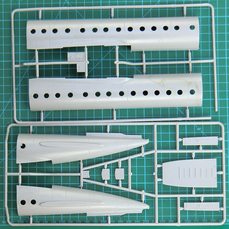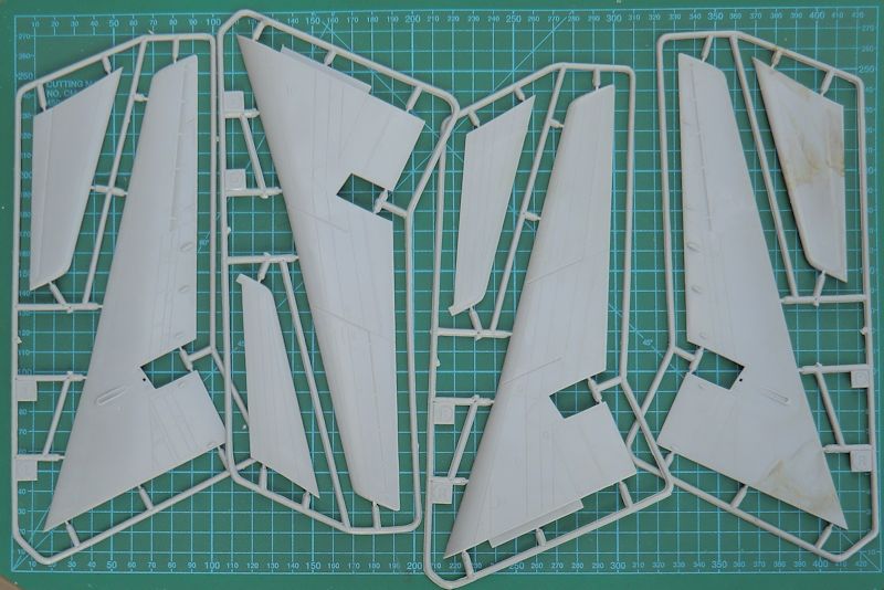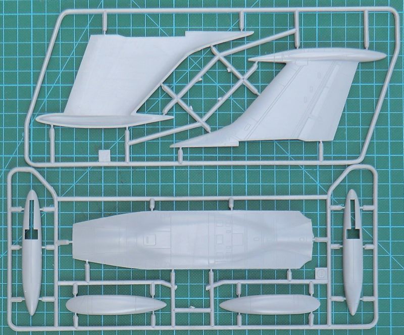 Die Flügel sowie Fin und Triebwerke sind in Ober- und Unterseite unterteilt. Für die Tragflügel sind noch die Gondeln für die Hauptfahrwerke zusammenzufügen und anzubringen. Die Hinterkanten sind bei Bedarf nachzuschleifen. Für die Triebwerke sind Ein-und Auslaufschächte enthalöten, die jedoch längs geteilt sind. Die Verdichterstufen sind etwas rudimentär dargestellt. Die Fahrwerke könnten auch paar Nachdetaillierungen vertragen.