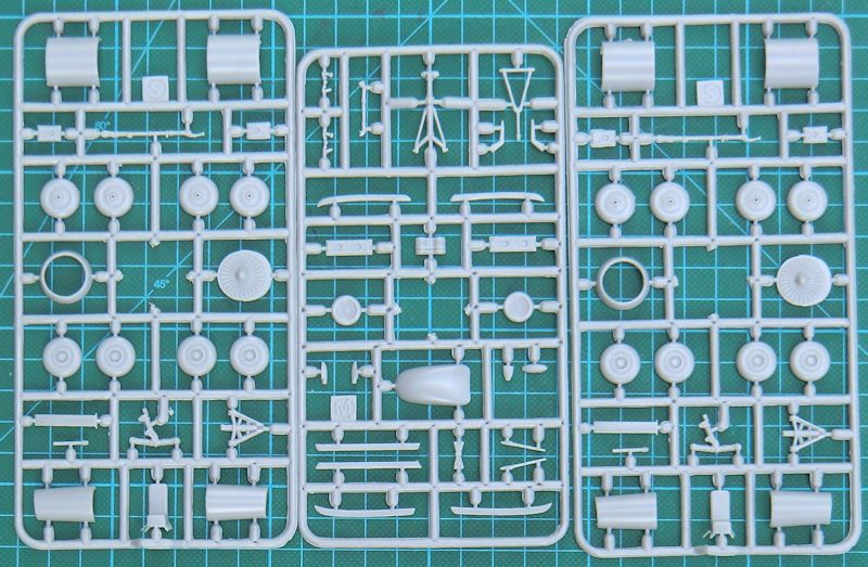 Insgesamt weisen alle Teile eine gute Oberflächendetaillierung auf. Die Gravuren der Rumpfteile sind jedoch etwas zu tief und dick geraten; Abhilfe schafft dünnflüssiger Sekundenkleber und anschließend feines Nachgravieren. Zu guter Letzt ist eine kleine Ätzteileplatine beigefügt. Dieser sind vorrangig für das Hauptfahrwerk vorgesehen. Dennoch verbessern Kanülen und Plastikprofile das Ergebnis.