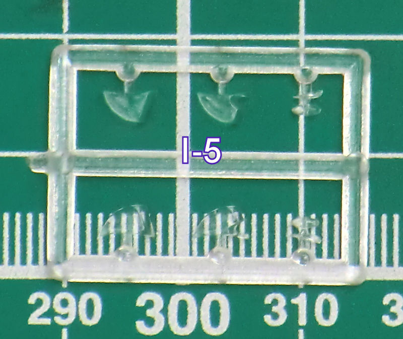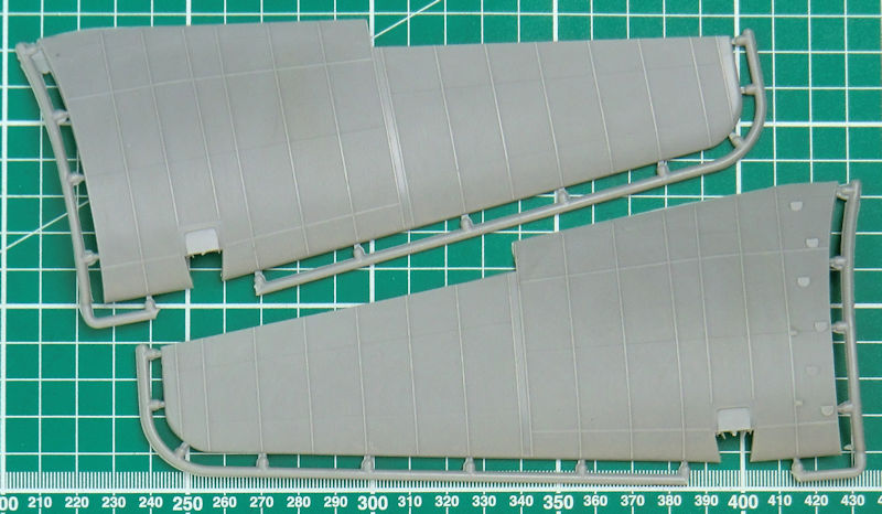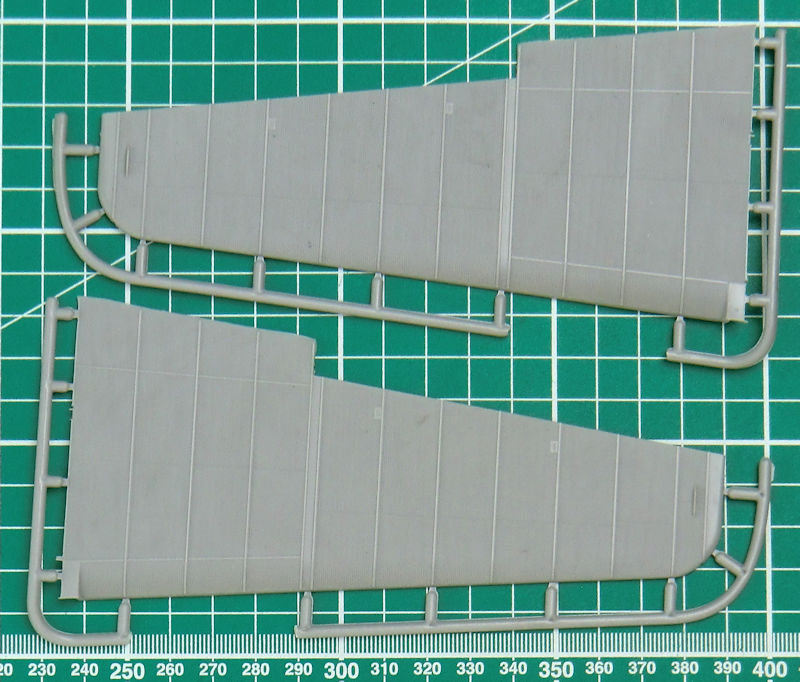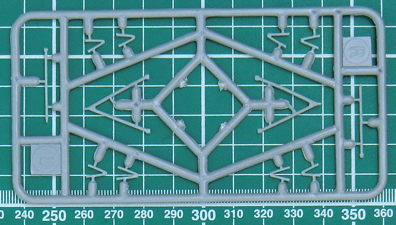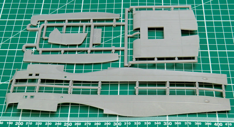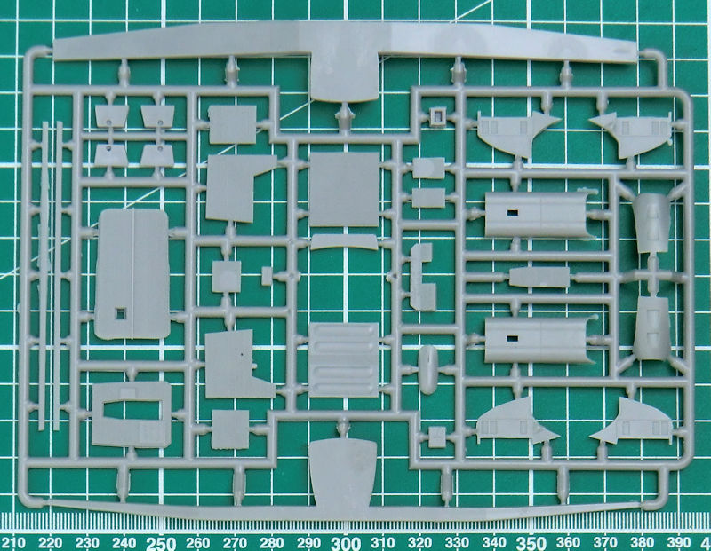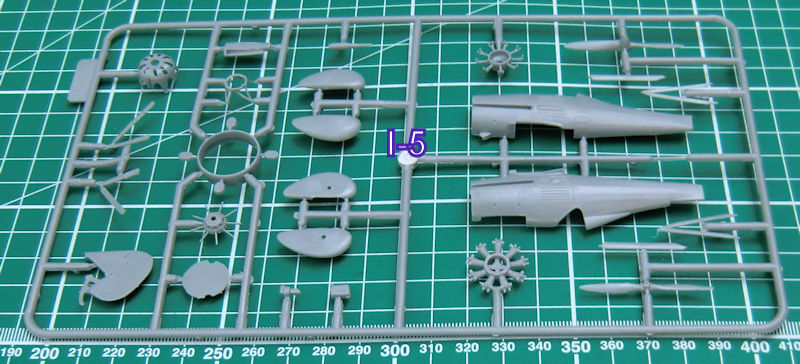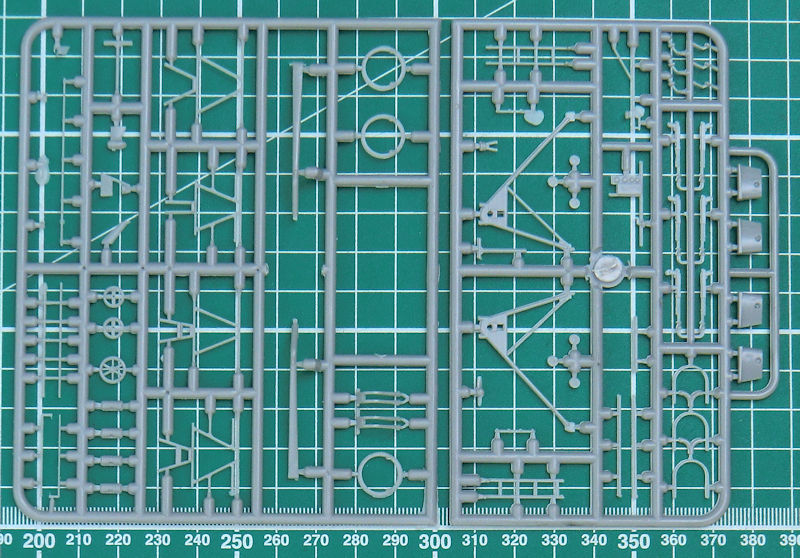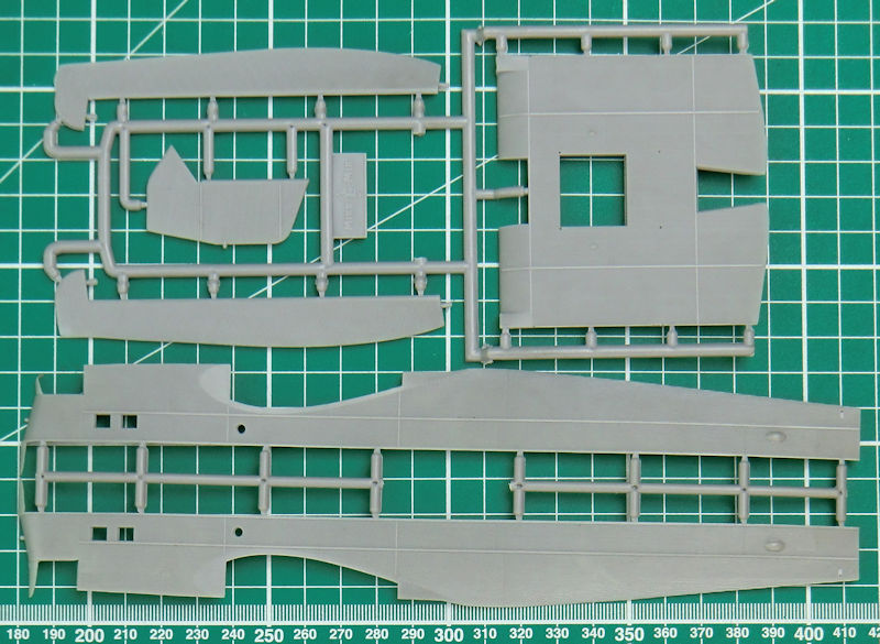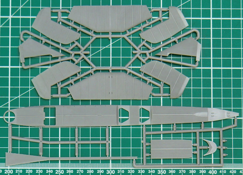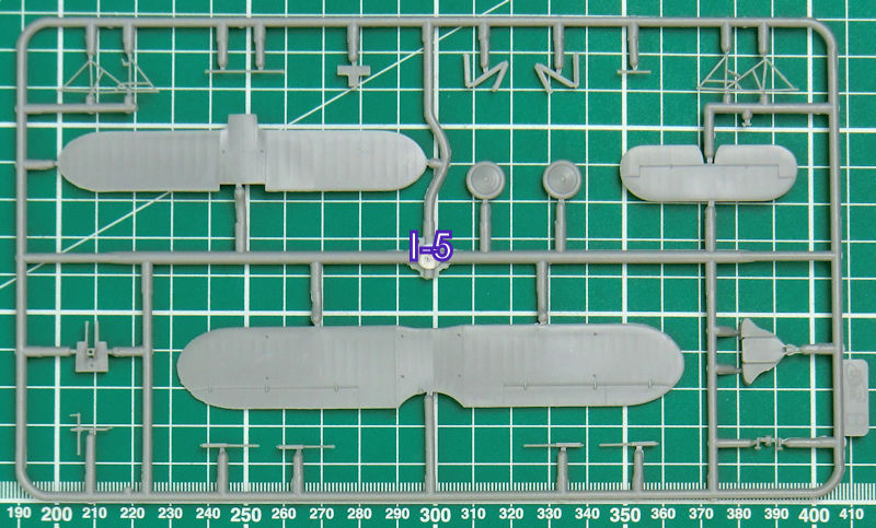 Die Abspritzung der Bauteile ist beim meinem Bausatz der TB-1 hervorragend. Sinkstellen sind nicht zu finden. Das ist bei der schönen feinen Wellblechstruktur sehr wichtig. Ein Spritzling ist für die Verbindungselemente zwischen TB-1 und I-5.