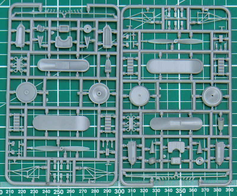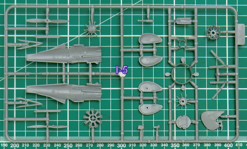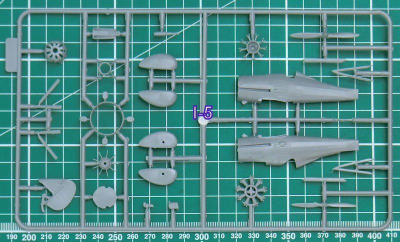 In dem stabilen Stülpkarton befinden sich gut verpackt 13 hellgraue Spritzlinge oder Großbauteile. Das sind insgesamt sind das 247 Einzelteile sowie 15 Klarsichtteile für die TB-1. Weiterhin gibt es je zwei Spritzlinge für die I-5 mit 46 Teilen und zwei Klarsichtrahmen mit zwölf Teilen. Dann findet man noch einen Fotoätzteilbogen, zwei Decals, weiße Masken für die Klarsichtteile der TB-1, die Bauanleitung und die mehrfarbige Bemalungsanleitung. Ein paar Bauteile sind für andere Versionen.