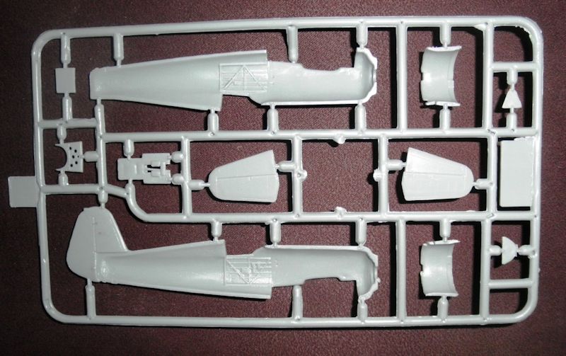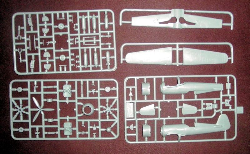 Die vier grauen Spritzrahmen sind alle sauber und gratfrei abgespritzt.Der Fahrwerksschacht ist ebenfalls graviert, Fahrwerkbeine und Räder sind auch gut dargestellt. Das Cockpit besteht aus Bodenplatte, Steuerknüppel, Sitz, Armaturenbrett und Kopfpanzer. Die Innenseiten des Rumpfes sind im Cockpitbereich graviert.