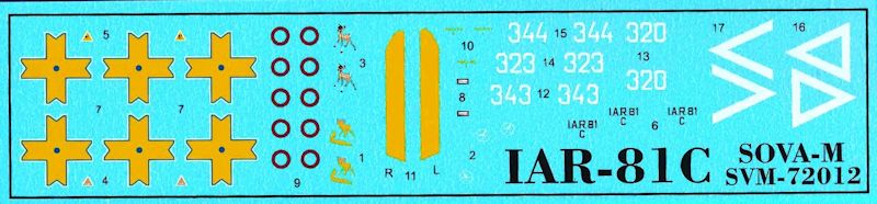 Bemalung: Der sauber auf blauem Papier gedruckte Decalbogen erlaubt den Bau der IAR-81C mit den Nummer 320, 323, 343 und 344 der rumänischen Luftwaffe aus dem Jahre 1943 bzw. 1944 mit Michaelkreuz.