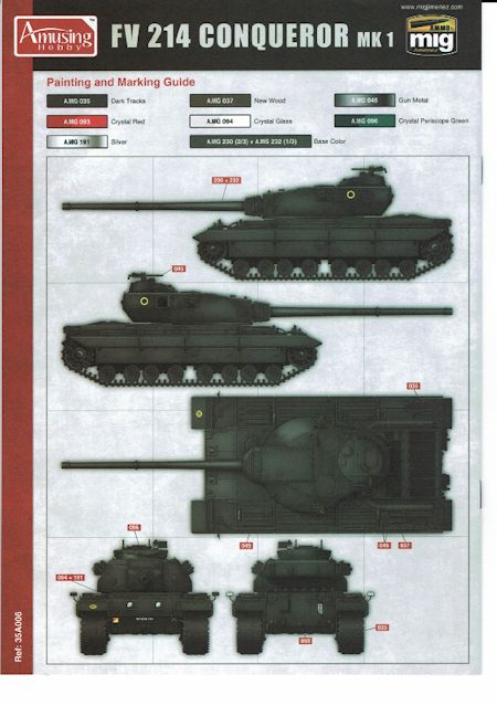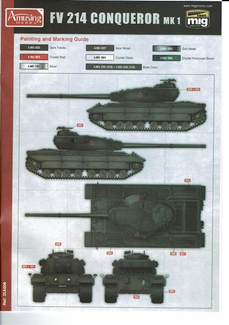 Bauanleitung/Bemalung: Die 16-seitige Bauanleitung führt übersichtlich durch 30 Bauabschnitte. Auf den letzten beiden Seiten der Bauanleitung sind zwei Farbprofile die den Kampfpanzer in dunkelgrün zeigen. Über Einheit, Zeitpunkt und Einsatzort wird der Modellbauer im Dunkeln gehalten. Die Farbangaben beziehen sich auf das Sortiment von Ammo mig. Der Decalbogen ist sauber und randscharf gedruckt.