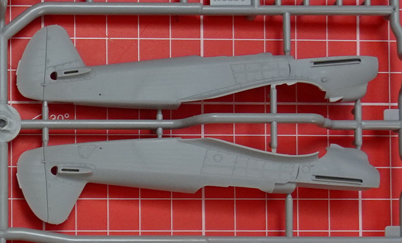 Das Höhenleitwerk entsteht aus zwei Hälften. Dadurch sind hier scharfe Hinterkanten vorhanden. Für den großen Kühler unter dem Mittelrumpf gibt es zur Darstellung der Struktur Fotoätzteile. Die Reifen der Hauptfahrwerksräder besitzen sogar eine erhabene Beschriftung. Auch die Fahrwerksklappen sehen vorbildgerecht aus. Der Einzugsmechanismus ist recht ordentlich getroffen.