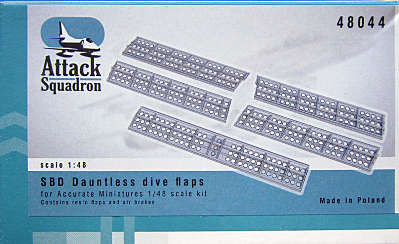 Für den Bausatz der SBD Dauntless von Accurate Miniatures (und seine Re-inkarnationen) bietet Attack Squadron diesen Resinsatz an. Die Teile sind sauber gegossen, haben aber etwas fischhaut in den Löchern der Sturzflugbremsen, die entfernt werden muss. Die Teile ersetzen einfach die Bausatzteile, uns sind damit nicht so umfangreich, wie z.B. der Satz von Eduard. Allerdings sind Sie auch einfacher anzuwenden.