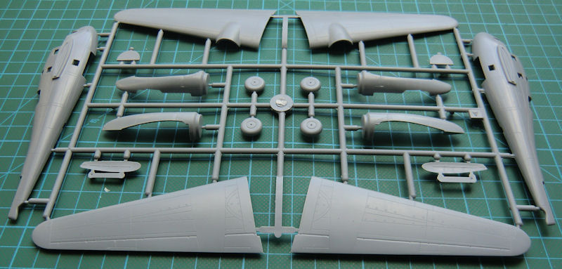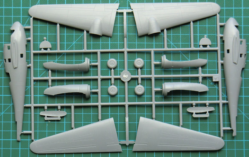 Die Bauteile sind wieder die typische Short-Run-Azur/MPM-Qualtiät mit feine Oberflächendetails aber mit groben Angüssen. Überraschungen gibt es hin und wieder bei der Passung. Der Bau beginnt hier mit dem Cockpit. Azur ist sogar noch ein Stück weiter gegangen und hat fast den gesamten Rumpf innen detailliert. So gibt es die Rumpfspanten und strukturierte Rumpfinnenseiten. Der Arbeitsplatz des Piloten befindet sich in einer detaillierten Cockpitwanne mit strukturierten Instrumentenbrett. Azur hat auch die Sitzgurte des Piloten nicht vergessen.