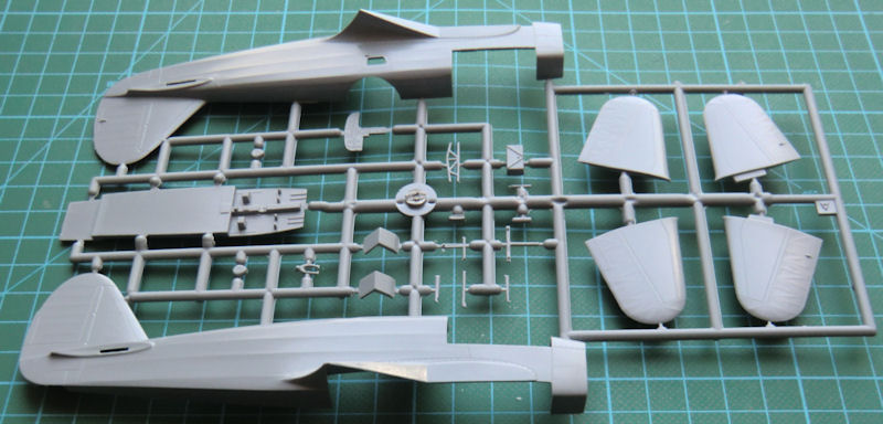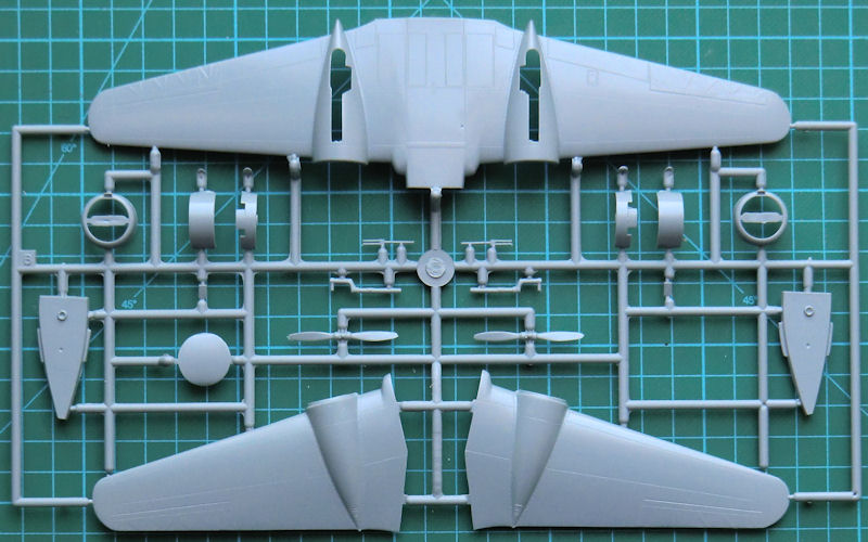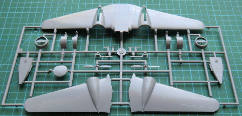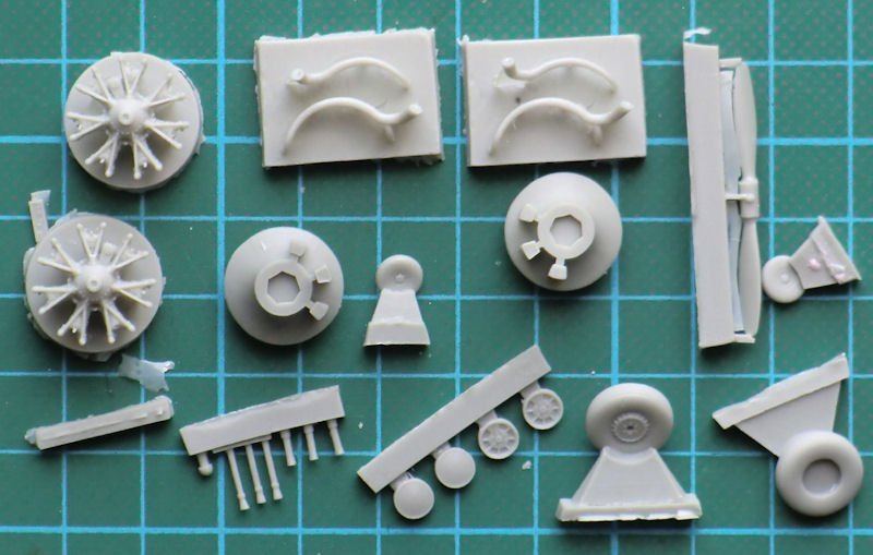 Rumpf und Tragfläche sind klassisch aufgebaut. Die Unterseite von letzterer besteht aus einem Stück. Das Höhenleitwerk besteht aus zwei Hälften. Hier gibt es dadurch eine scharfe Hinterkante. Das Fahrwerk ist ausrechend detaillierter. Es gibt hier einige Alternativen zu beachten. Die beiden Resinsternmotoren sind sehr gut gegossen. Dank der Halterungen und der Auspuffleisten sieht es hier vielversprechend aus. Nach dem Zusammenbau bleibt von der Pracht zumindestens ein Teil zu sehen. Eine Luftschraube liegt aus Resin dabei. Dadurch ist es möglich diese auch gegenläufig zu montieren. So scheint es auch im Original gewesen zu sein.