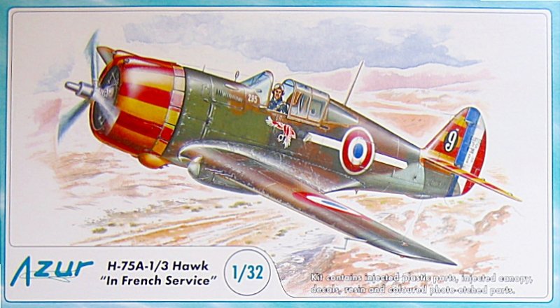 Bausatz: Neu von Azur ist die Curtiss H-75A-1 Hawk. Kit-No. A045 beinhaltet die Ausführung "In French Service" mit entsprechenden Decals. Typisch Short run, ist die hawk insgesamt ein wirklich tolles Modell. Einzelteilaufteilung lässt noch einige Kitoptionen zu, so dass von der MPM Gruppe sicher noch weitere Versionen dieses Bausatzes erscheinen werden. Gut ist diesmal, das die Resinteile für die Detaillierung des Modells gleich mit dabei sind. Vorher gab es meist einen separaten Hi Tech-Kit in der 32er-Serie von Azur.