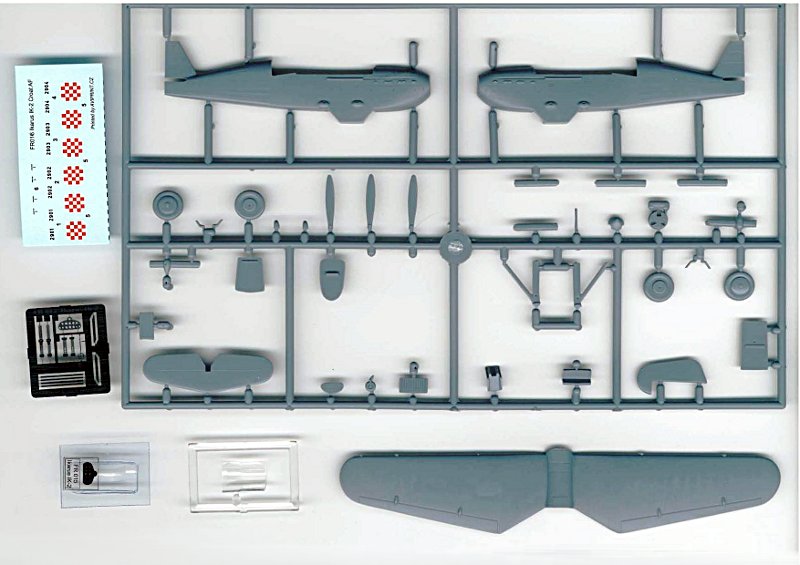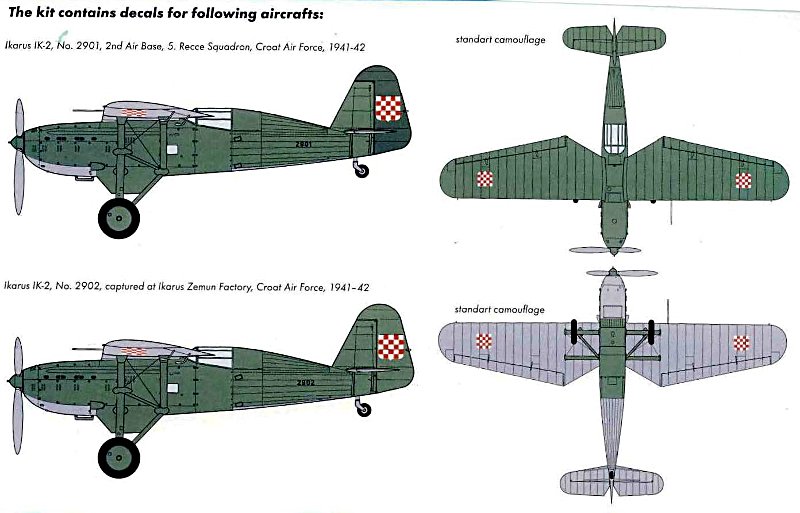 Bausatz: Das Modell ist nicht der erste Spritzgußbausatz der IK-2, denn bereits Mitte der achtziger Jahre gab es diesen Exoten bereits von Guano Zeppelins Works. Danach folgten noch zwei Generation von Resinbausätzen von CMK, letzterer mit einen sehr guten Decalsatz. Der neue Bausatz ist natürlich bedeutend besser detailliert. Ein Spritzrahmen mit allen nötigen Spritzgußteilen, ohne große Angüsse, sowie die Tragfläche als extra Teil, zwei Kanzeln, eine davon aus Spritzgußmaterial und eine tiefgezogen. Ein Decalsatz für alle vier kroatischen IK-2, in kleiner Ätzteilsatz und ein Film für das Armaturenbrett. Gute Bauanleitung und Bemalungsshemen auf der Rückseite des Kartons. Der zweite Bausatz der IK-2 enthält statt der kroatischen Decals lediglich jugoslawische Decals und Bemalungsshemata ist ansonsten jedoch identisch.