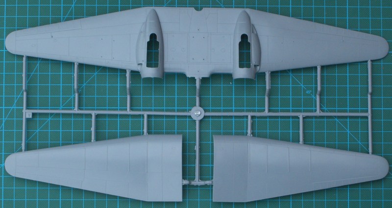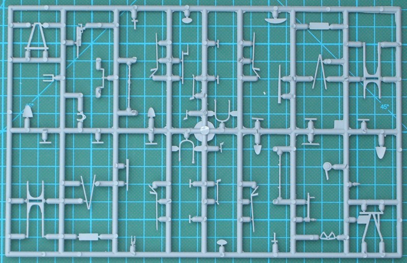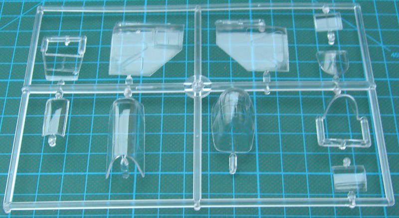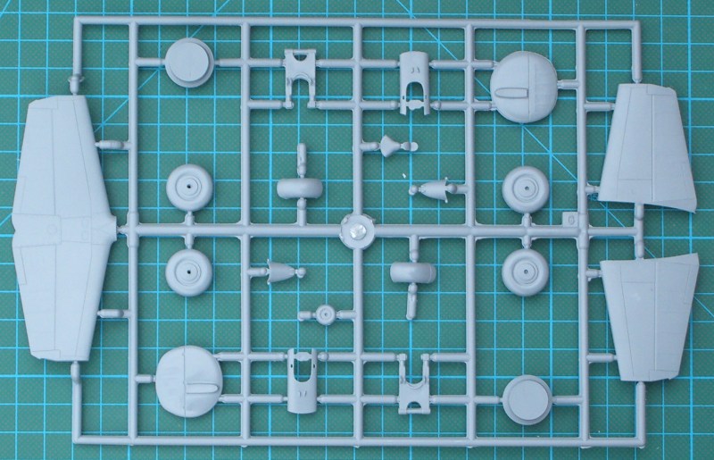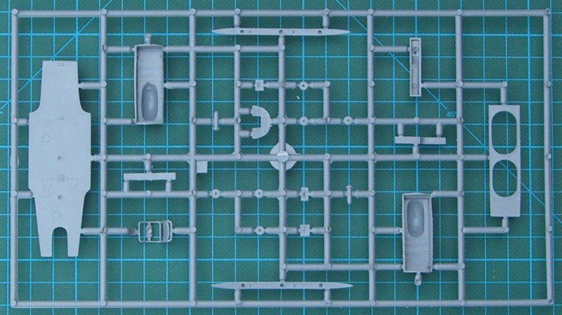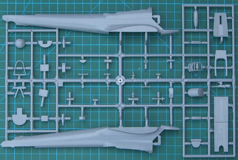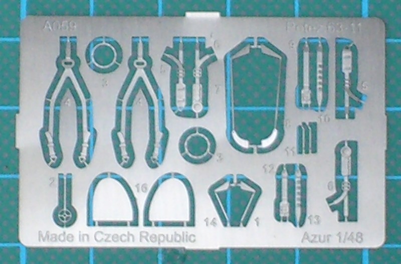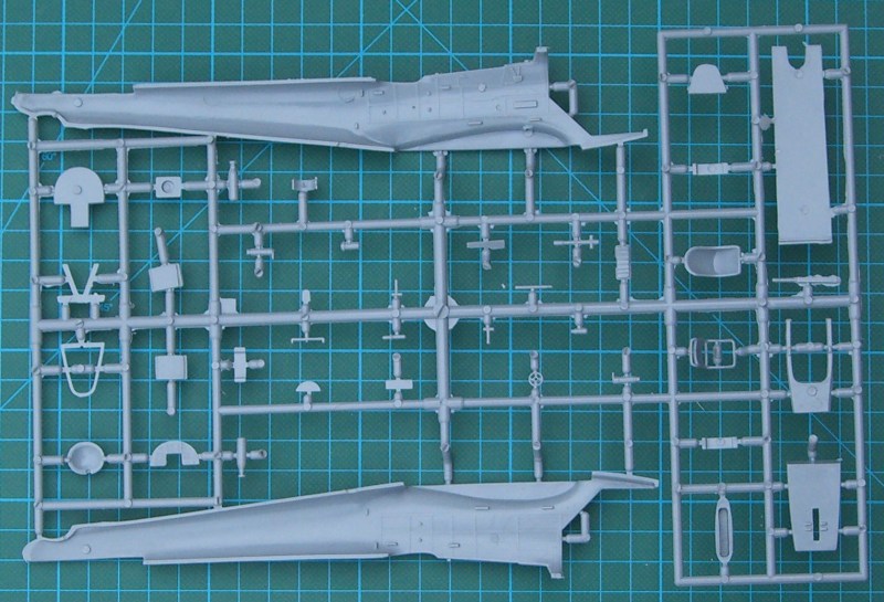 Der Bausatz enthält sechs hellgraue Spritzgussrahmen, einen Fotoätzteilbogen - leider nicht bedruckt - , ein paar Resinteile und die Klarsichtteile aus Spritzgussmaterial. Die Spritzgussteile sind wieder typisch MPM - sehr feine Strukturen und trotzdem immer ein wenig Grat - . Ein paar Teile wandern in die Grabbelkiste. Das Cockpit entsteht aus einer Kombination von Spritzguss-, Resin- und Fotoätzteilen. Hier hat Azur auch die Sitzgurte nicht vergessen. Durch die strukturierten Seitenpanele lässt sich ein sehr gut detailliertes Cockpit herstellen. Natürlich wird dieses auch durch die vielen Glasteile provoziert. Wer diese allerdings ganz geöffnet darstellen möchte, der muss zur Säge greifen.