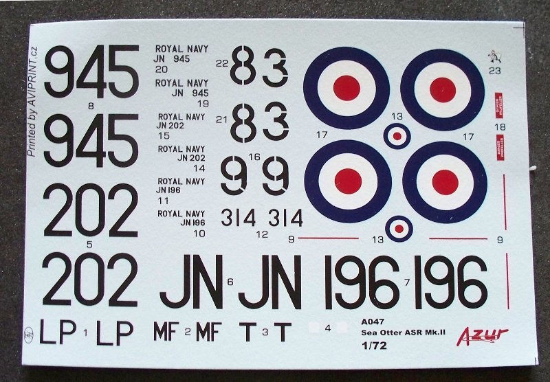 Der Bausatz widmet sich der "Sea Otter" aus der Nachkriegszeit. So gibt es drei Deco-Varianten der Royal Navy, alle in Extra Dark Sea Gray und Sky, wovon eine Maschine auch noch am Korea-Krieg teilnahm.