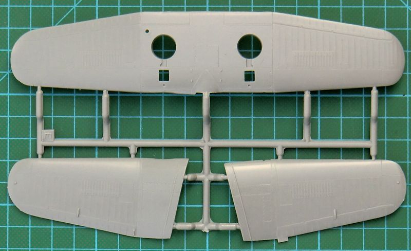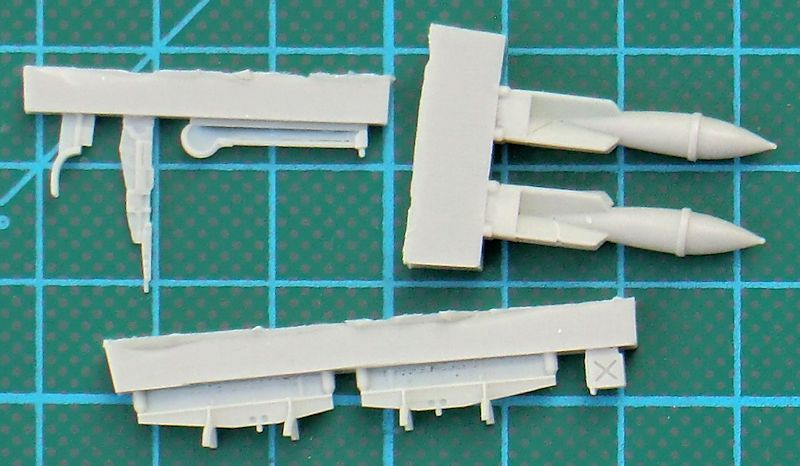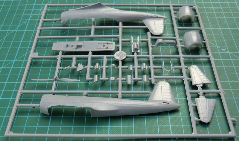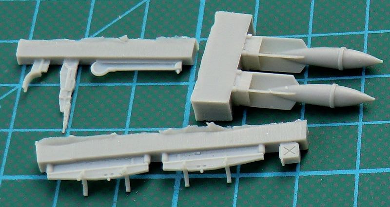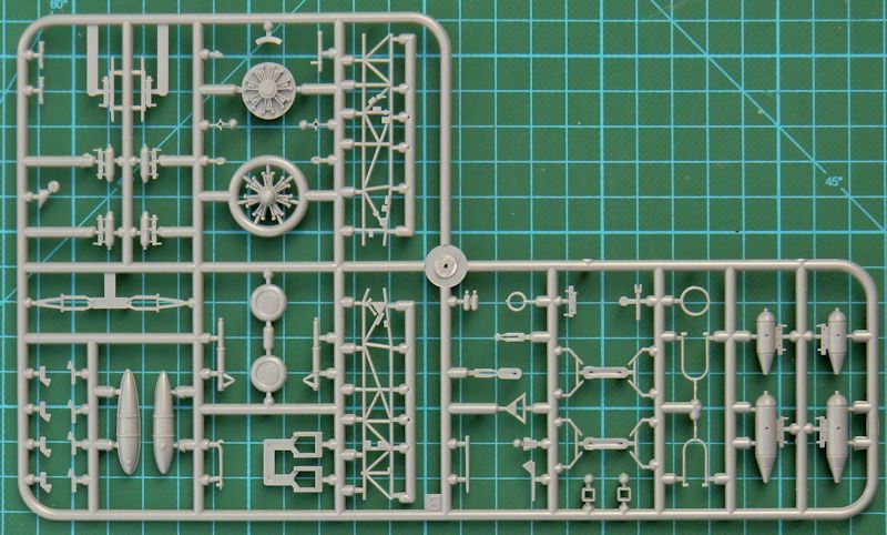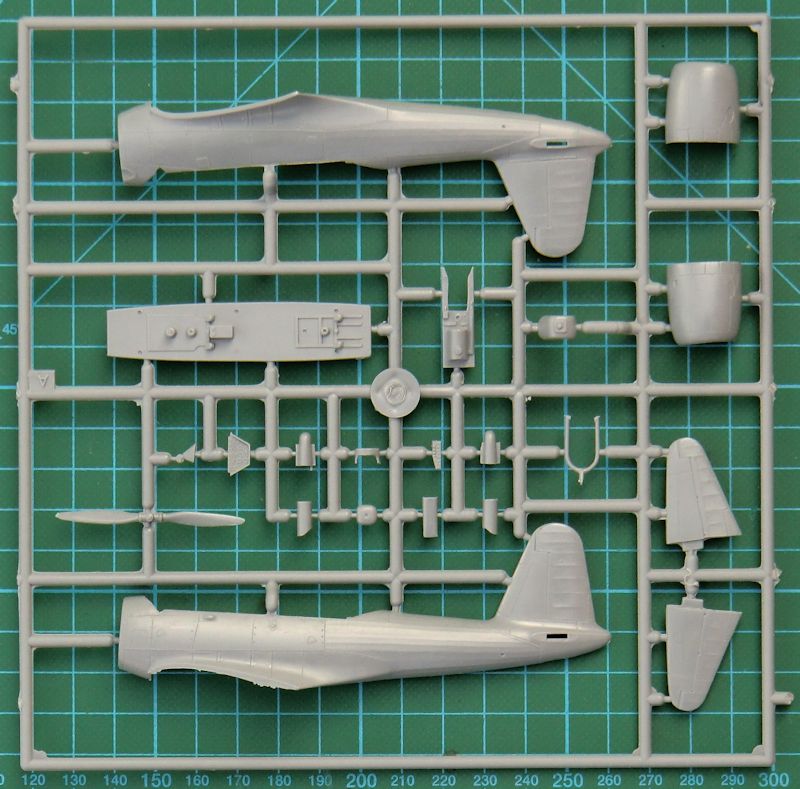 Der Motor entsteht aus zwei Teilen. Dieser verschwindet in der aus drei Teilen bestehenden Motorhaube. Die Tragfläche besteht klassisch aus drei Großbauteilen. Die beiden Hälften des Höhenleitwerks besitzen eine scharfe Hinterkante. Das Fahrwerk sieht ordentlich aus. Damit schließe ich die Fahrwerksscheren ausdrücklich mit ein. Die Abwurfwaffen werden an sehr feinen Aufhängungen befestigt. Zwei kleinere Bomben sind aus Resin. Die Kanzel besteht aus einem Stück und ist sehr klar.
