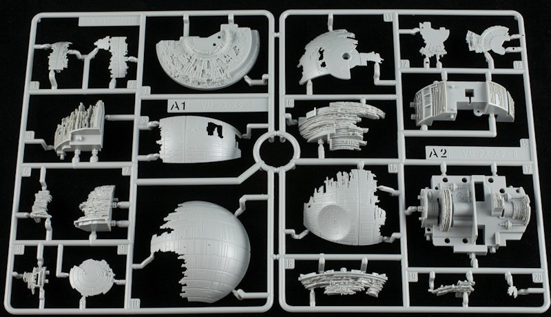 Der Maßstab von 1:2700000 für den Todesstern dürfte so ziemlich das Heftigste sein, was je als Verkleinerung eines Raumfahrzeugs herausgebracht wurde. Am Ende ist das Modell nicht einmal tennisballgroß, aber wie von Bandai gewohnt sehr fein detailliert. Das Relief an der Kugeloberfläche ist vielleicht etwas stark geraten.