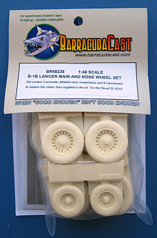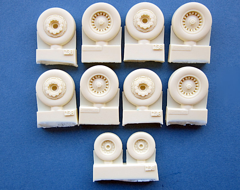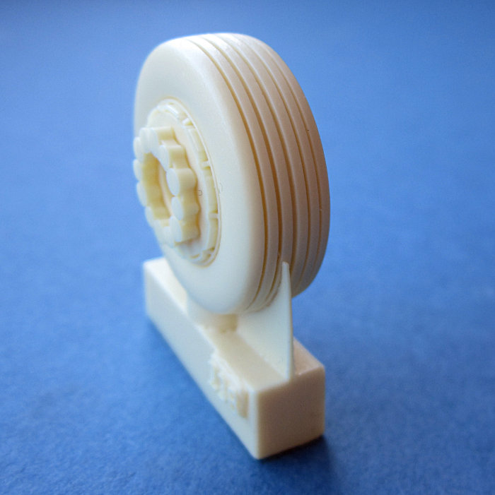 Der dritte Satz enthält die Räder für B-1B. Wieder massiv Resin hat man mit diesem Satz garkeine Probleme. Die Resinteile ersetzen einfach jene aus dem Bausatz. Für jedes Rad gibt es auch Masken, so dass man die Reifen erst schwarz bemalen kann und anschließend die felgen weiß. Wegen der Einfachheit gibt es hier auch keine Bauanleitung. Die Reifen sind übrigens nur ganz leicht abgeflacht, so dass der Knochen keinen Platten hat, wie es öfter mal bei anderen Herstellern auftritt.