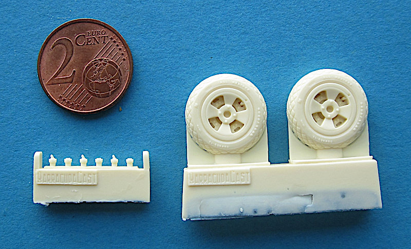 Der erste dieser Sätze zeigt das typische Rautenmuster (diamond tread) vieler Reifenhersteller aus dieser Zeit. Der Guss ist makellos und zeigt im Bereich der Felge schöne Details. Die Resinteile ersetzen einfach jene aus dem Bausatz. Die Nabenmuttern liegen Separat bei und müssen entsprechend der Montageseite unterschiedliche eingeklebt werden. Dies ist in der kleinen Bauanleitung beschrieben, die auch allgemeine Hinweise zur Be- und Verarbeitung der Resinteile enthält.