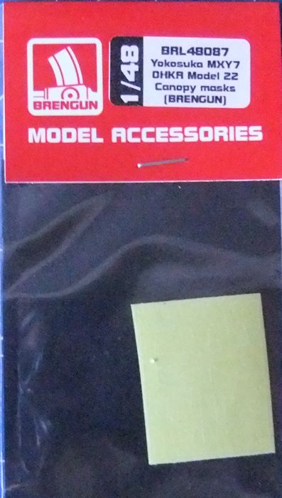Yokosuka Modell 22 "Ohka" liefert Brengun unter der Bezeichnung Model Accessories ein eigenes Maskierset für die Kabine der bemannten Bombe aus. Der kleine Bogen lagert in einer Tüte mit schwarzem Hintergrund. Eine Zeichnung für die Platzierungen der einzelnen Masken ist nicht vorgesehen. Gegen Licht gehalten, ist aber klar zu erkennen, wie das Anbringen der Abdeckungen zu erfolgen hat.