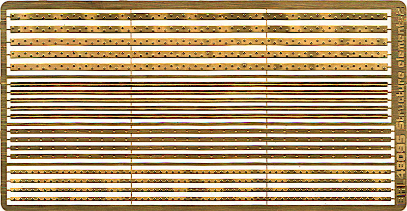 Brengun bietet hier zwei generische Sätze für die Verwendung im Modellbau an. Dieser zweite Satz enhält Streifen unterschiedlicher Breite mit verschiedenen erhabenen Nieten. Die Verwendungsmöglichkeiten sind vielfältig sowohl für Flugzeuge, Fahrzeuge und Panzer als auch für Gebäude und andere Objekte.