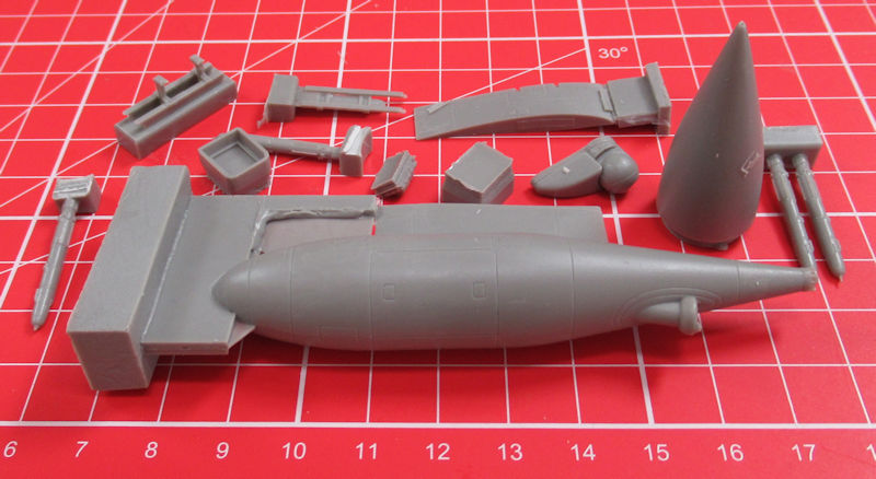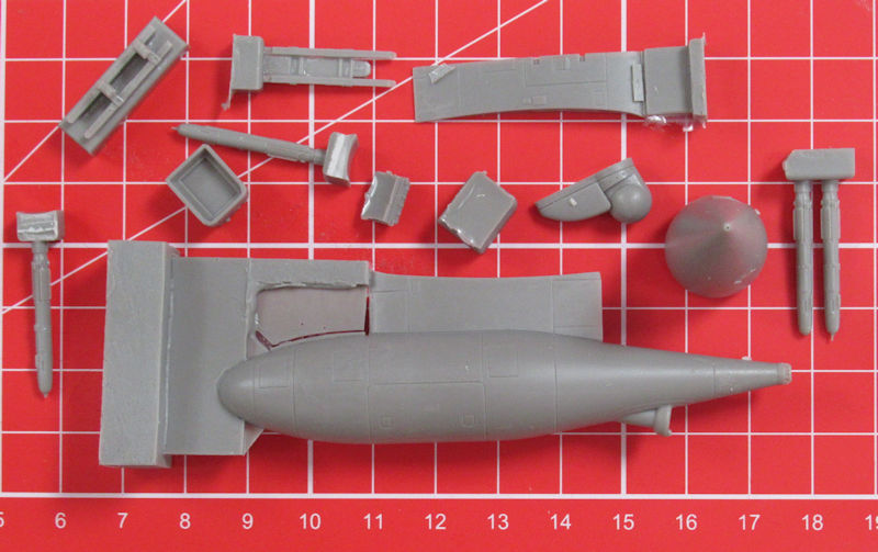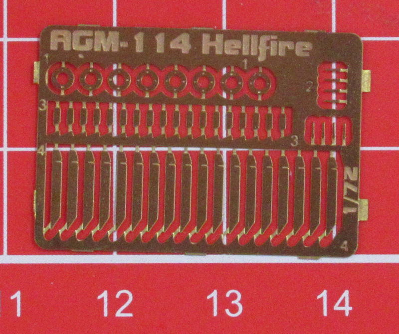 In der stabilen Box befinden sich gut verpackt 16 sauber gegossene Resinteile, ein kleiner Fotoätzteilbogen, ein Decal und die übersichtliche Bauanleitung. Die größte Fummelei dürfte der Anbau der winzigen Steuerflächen an die vier Hellfire-Raketen sein. Für diese sind auch die Decals. Ein Nachteil gibt es allerdings auch. Es fehlen die Markierungen für die passende KC-130J. Diese findet man bei Warbird Decals.