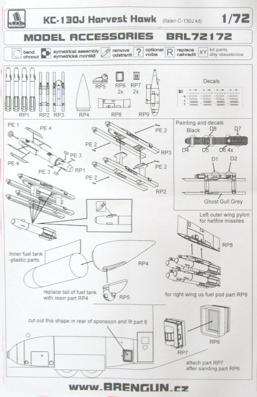 Detailsatz: Attack Squadron(das Logo findet sich auf dem Decalbogen) hatte vor einige Zeit ein KC-130J Harvest Hawk-Umbauset im Maßstab 1/72 im Angebot. Diese Urform ist inzwischen bei Brengun in Tschechien angekommen und nun ist dieses gut gemachte Set wieder erhältlich. Gedacht ist es für den C-130J-Bausatz von Italeri.