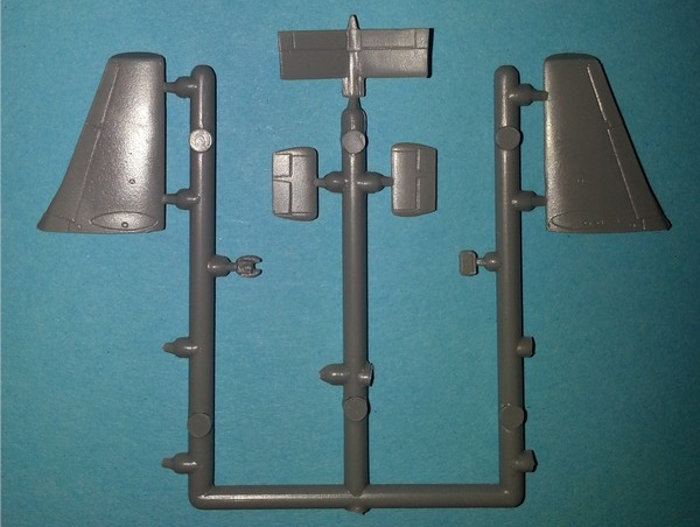 Die Gravuren auf den großen Bauteilen sind m.M. nach genau richtig in der Feinheit und sollten nach dem Farbauftrag dem Modell beim näheren Betrachten eine detaillierte Tiefe geben. Das Cockpit ist komplett vorhanden und für den Maßstab völlig ausreichend. Die Hinterkanten der Trag- und Steuerflächen sind einteilig und damit sehr fein. Das Höhenruder ist einteilig mit einen Teil des auslaufenden Rumpfes gegossen, somit ergibt sich die positive V-Stellung von alleine. Die Tragflächen haben auf der Rumpfseite ein kleines Passstück für eine Öffnung im Rumpf, Des Weiteren ist auch die Wölbung der Rumpfseite in diesem Bereich mit anmodelliert. Eine erste Probepassung zeigte keine Probleme in diesem Bereich. Das Triebwerk wird schön mit Ein- und Auslass dargestellt, die Wandstärke des Gehäuses im Auslass ist sehr fein. Der Einlaufring ist ein einteiliges Bauteil, so dass eine sonst nervige Naht im Einlauf entfällt. Theoretisch erleichtert das auch das Lackieren, wenn die Passung gut ist.