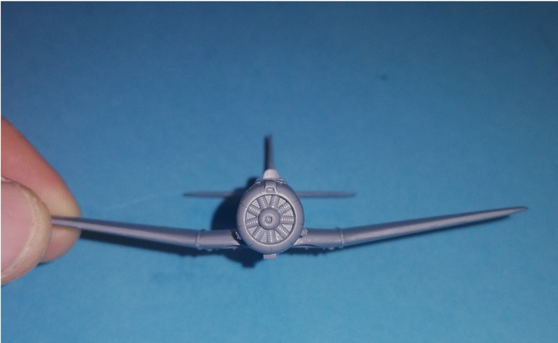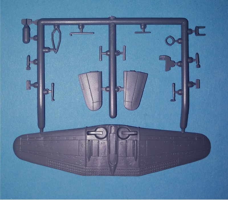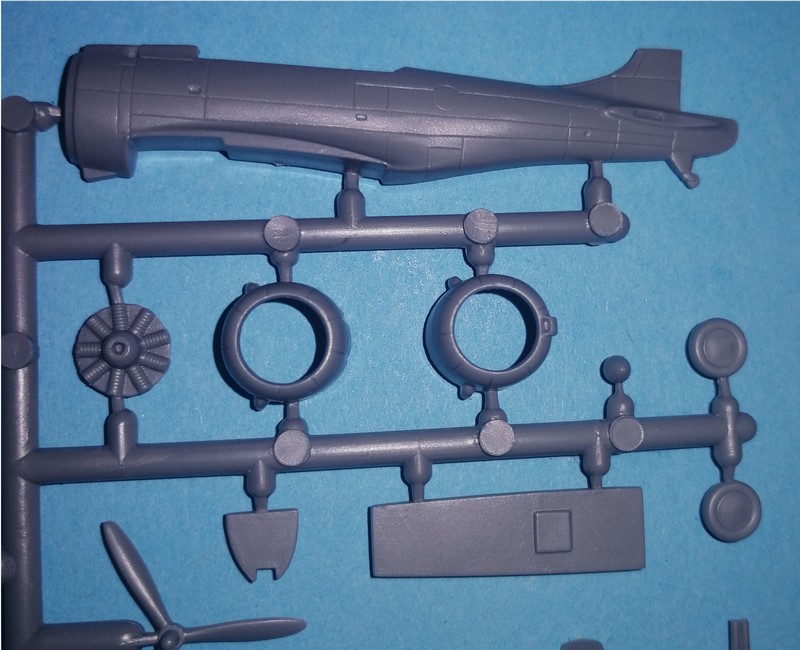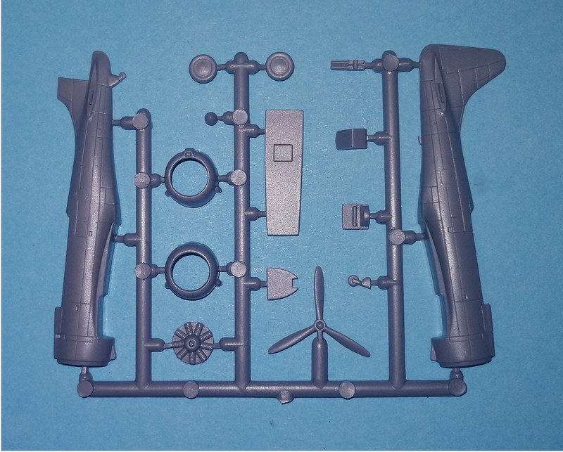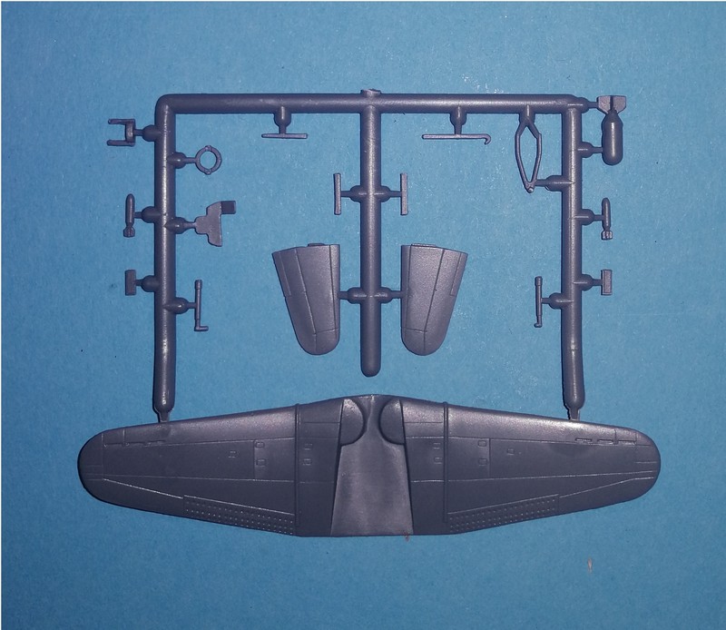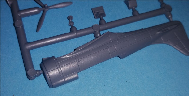 Dies sieht man auch am Propeller, welcher ohne Veränderung eher dem einer späten Ausführung entspricht. Am Rahmen findet sich jedoch das Bauteil 15, welches zum dicken Spinner der frühen Variante mit mechanischer Blattsteigungsverstellung passt. Dies wird jedoch nicht in der Bauanleitung gezeigt. Den Abschluss bildet die Montage des Hauptfahrwerkes und der Abwurfbewaffnung. Die Darstellung beider Bereiche ist ok. Die Abdeckklappen sind recht dick, was sich aber mit runterschleifen schnell beheben lässt. Gut wiedergegeben ist auch die Aufhängungsgabel der Bombe, welche die Freigängigkeit gegenüber dem Propellerkreis sichert. Das Spornrad der Trägervariante ist bereits am Rumpf mit anmodelliert. An Abwurfwaffen sind zwei leichte Bomben für die Tragflächen und eine größere für die Rumpfstation vorhanden. Bei der größeren Bombe findet man eine Sinkstelle, welche sich aber leicht mit Spachtel auffüllen lässt.