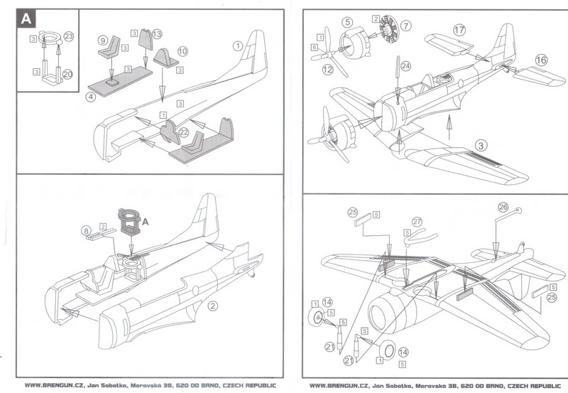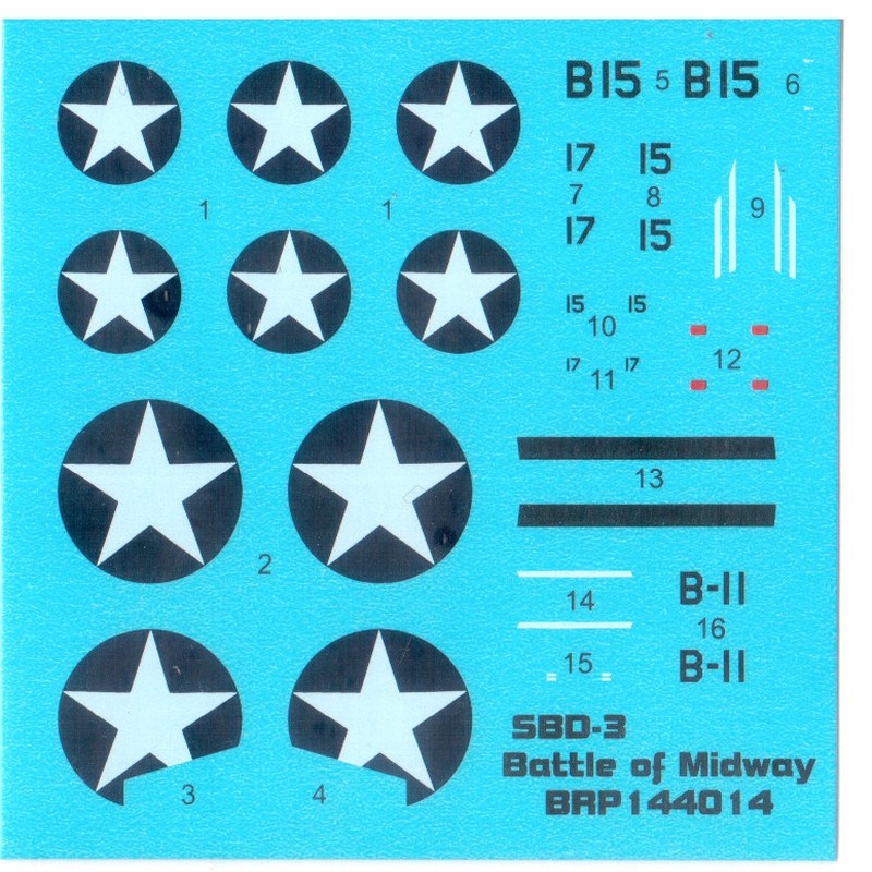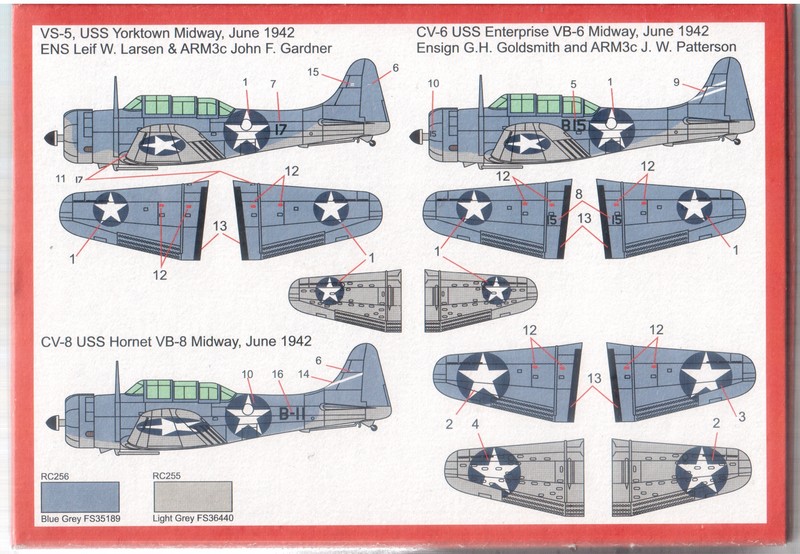 Den Verbau der Teile zeigt die Bauanleitung in sechs Schritten klar und deutlich. Es werden auch Farbangaben für Detailbereiche gemacht. Die Bemalung im Allgemeinen und die Position der Abziehbilder werden auf den farbigen Grafiken auf der Rückseite des Kartons gezeigt. Neu ist hier, das Brengun sich bei den Hauptfarben auf das Programm der Real Colors von AK Interactive bezieht. Die Decals sind glänzend in guter Qualität gedruckt. Entsprechend dem Thema der Box "Midway" sind die drei möglichen Optionen dieser Schlacht im Pazifik zugeordnet. Optisch markant ist bei allen Varianten die mittlere Form des Hoheitsabzeichens.