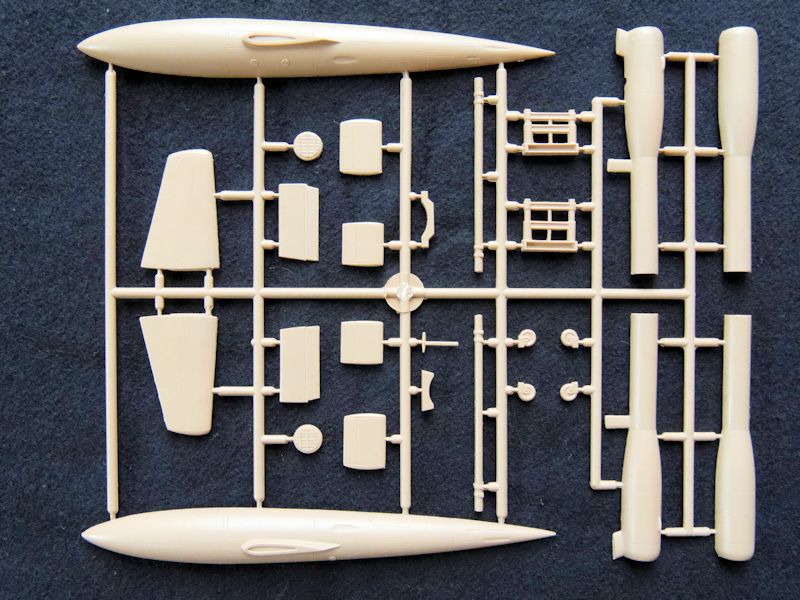 Der mit einem sehr schön illustrierten Bild gestaltete Karton enthält einen sandfarbenen Spritzling mit 27 Teilen. Hiervon werden jedoch zwei nicht benötigt. Die Einzelteile machen einen guten Eindruck und auch die Auswerferstellen sind so günstig platziert, dass hier keine Spachtelarbeit notwendig sein dürfte. Die einzelnen Panels der Oberfläche sind äußerst fein und sauber wiedergegeben. Der Bausatz enthält auch einen Transportwagen, zur Präsentation der Bombe.