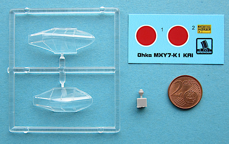Bausatz: Nach und nach bringt Brengun auch Modelle für Freunde des 48er Maßstabs heraus. Neben der Gießkunststofflinie seit einiger Zeit auch in Spritzguss. Im Moment beschränkt sich Jan Sobotka auf kleinere Modelle, sicher passend zu den vorhandenen Spritzgussmaschinen. Dies ist nun die zweite Variante der Ohka im Brengunprogramm. Zwei Graue und ein klarer Gießrahmen, sowie ein Resinteil und ein kleiner Decalbogen sind für den Bau vorhanden.