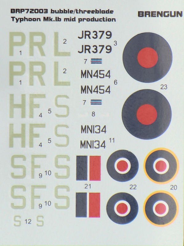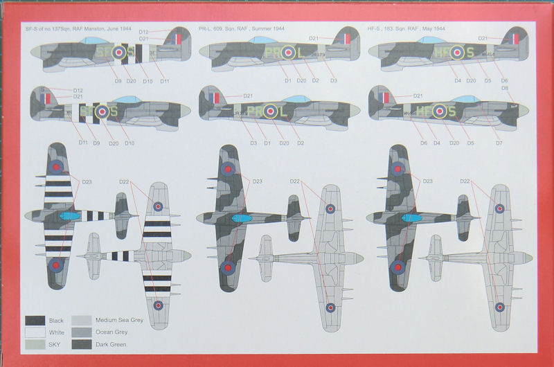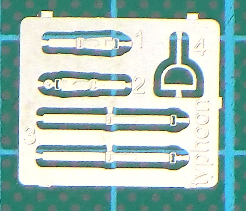 Für die Traglächenunterseite gibt es acht Waffenstationen samt Raketen. Die beiden Landescheinwerfer sind mittels Klarsichtteilen dargestellt. Die Schiebehaube kann alternativ offen angeklebt werden. Allerdings ist sie als Spritzgussteil nicht ganz vorbildgerecht dünn, wie bei allen anderen Herstellern der Branche auch. Es gibt übrigens auch eine Kanzelverkleidung für die frühe Typhoon.