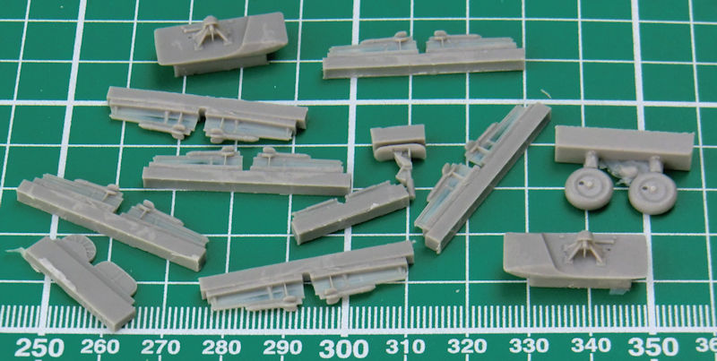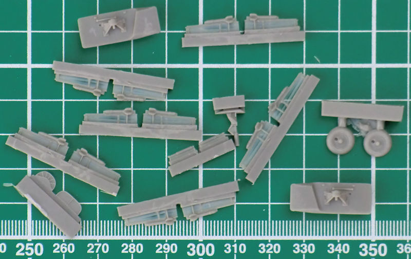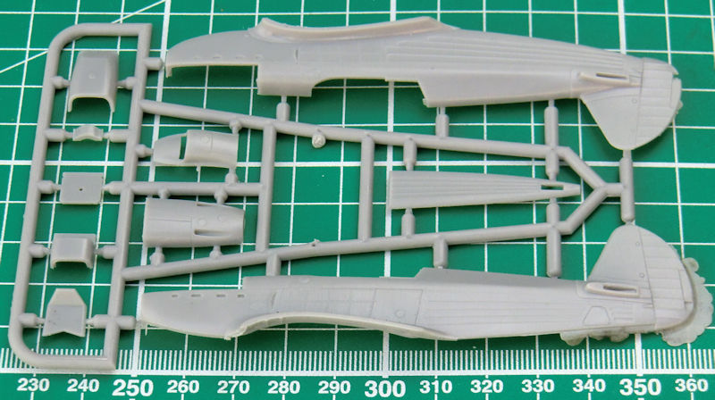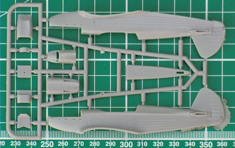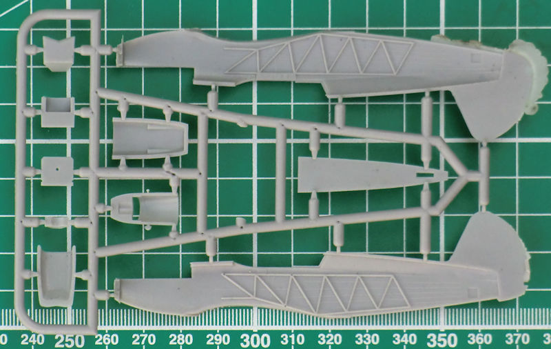 In der kleinen attraktiven unpraktischen Schüttbox befinden sich gut verpackt drei hellgraue Spritzlinge mit 57 Einzelteilen, ein Fotoätzteilbogen, 15 Resinteile, einen Rahmen mit zehn Klarsichteilen, ein Decalbogen und die typische Bauanleitung. Ein paar Teile wandern immer in die Restekiste, denn schließlich kann man nur ein Modell bauen. Bei den Spritzgussteilen handelt es sich um typische Short-Run-Produkte. Es gibt feine Strukturen aber auch Grat. Sehr gelungen sind die neuen Resinteile für das Skifahrwerk.