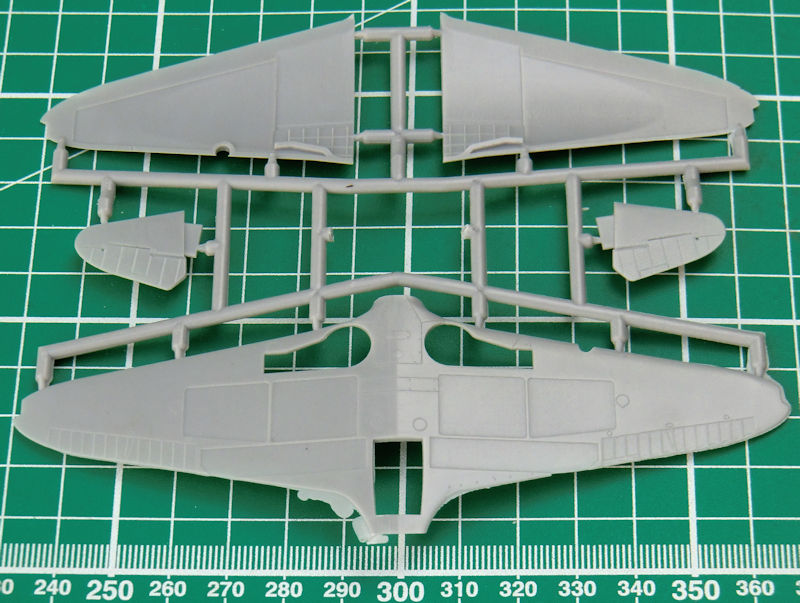 Das Höhenleitwerk besteht aus zwei Teilen. Es müssen noch die Laschen gekürzt werden, da die Gegenstücke im Rumpfheck nicht durchbrochen sind. Dafür gibt es dort scharfe Hinterkanten. In der Tragfläche kann man sehr gut detaillierte Hauptfahrwerksschächte zusammenbauen. In die Tragflächenunterseite müssen vier Fotoätzteile eingeklebt werden damit die Strukturen mit dem Vorbild übereinstimmen. Auch die Lande- sowie die Fahrwerksklappen sind aus Fotoätzteilen. Leider gibt es bei der Tragfläche keine scharfen Hinterkanten.